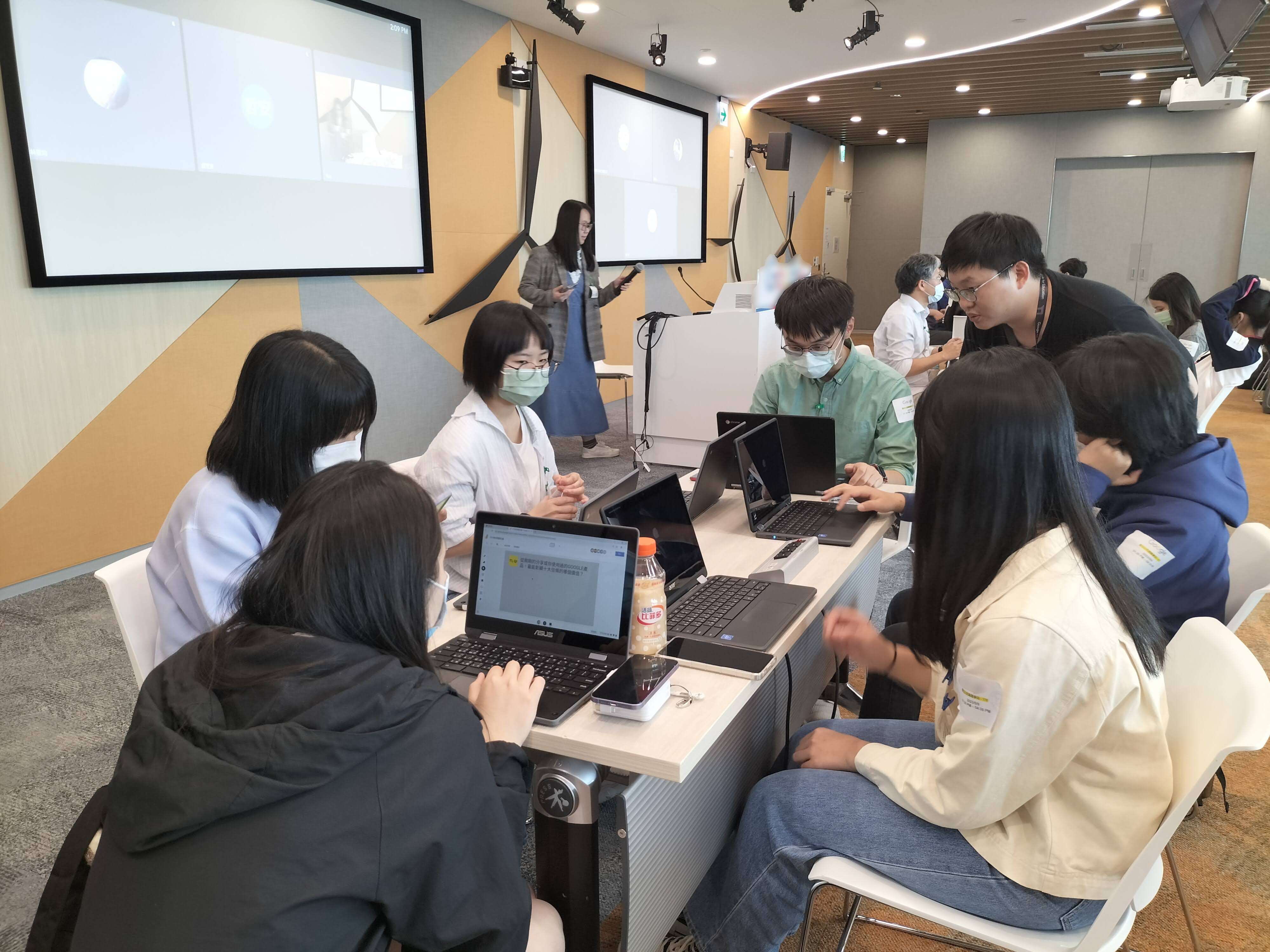 本學期課程亦與晶盛科技(JStech)協同國際知名科技企業,共同辦理「真人圖書館」職涯分享課程,透過「世界咖啡館」的分組形式,由學校教師帶領學生反思講者分享,同步使用數位工具進行整理討論,最後再精煉問題方向,對講者提出有效提問。藉由雙方的「深度對話」,讓學生理解企業面對問題的處理方式,以及決策的標準流程與優先順序,也讓學生從中學習到「要能問出好的問題,需能真正理解內容、聚焦問題面向;打磨出好的提問,才能精確獲取更好的解答」。