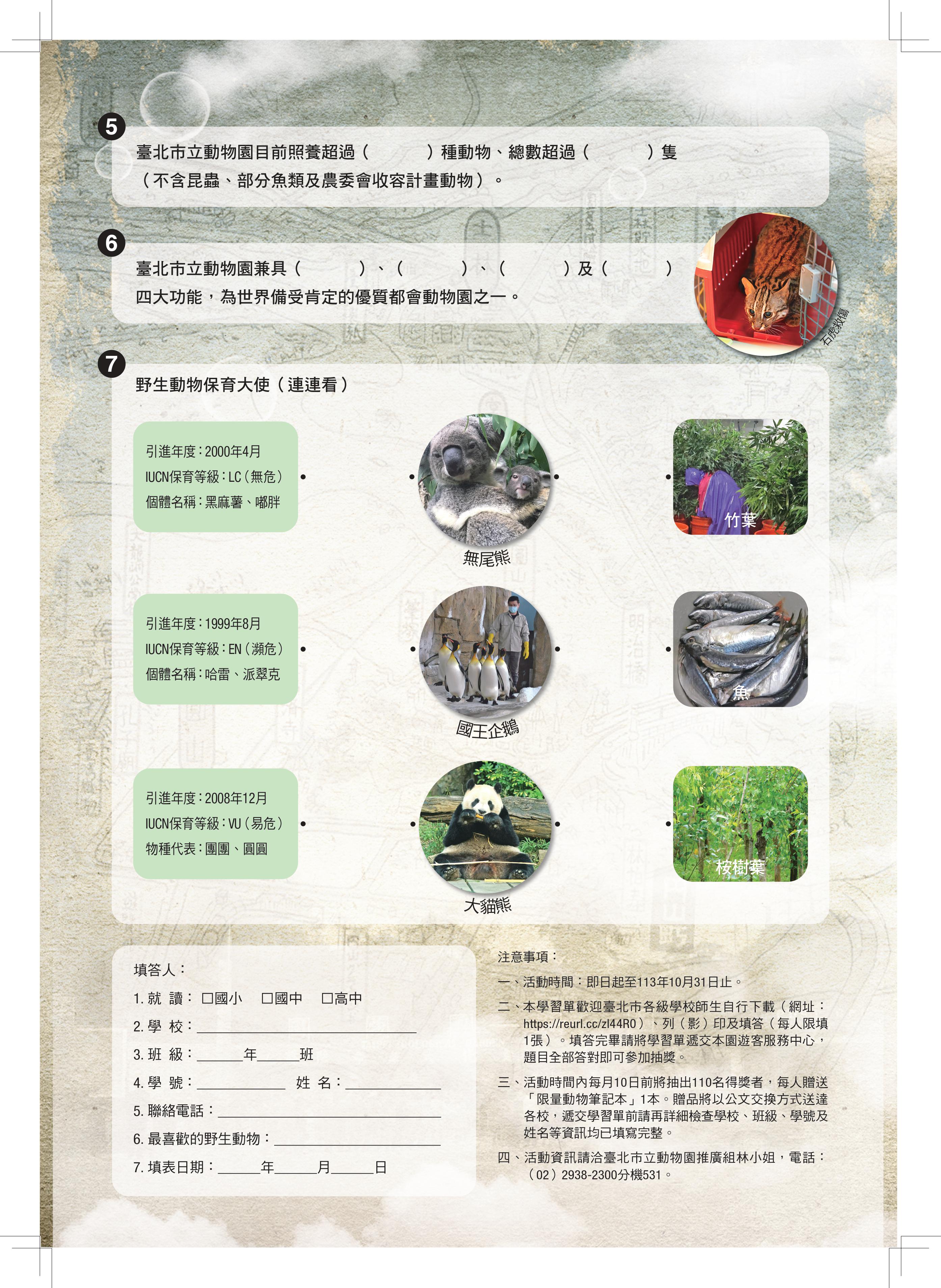1、 附件學習單歡迎自行下載(網址:https://reurl.cc/zl44R0)、列(影)印及填答(每人限填1張)。填答完畢請將學習單遞交本園遊客服務中心,