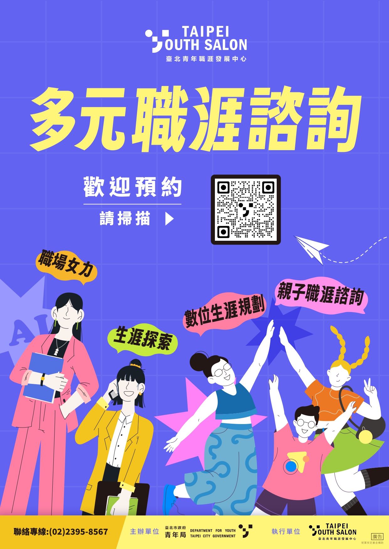 為促進青年職涯發展,本局臺北青年職涯發展中心提供職涯諮詢服務,並就「親子職涯溝通」、「數位生涯規劃」 及「女性職涯發展」三大主題,提供專屬職涯探索與發展服務。