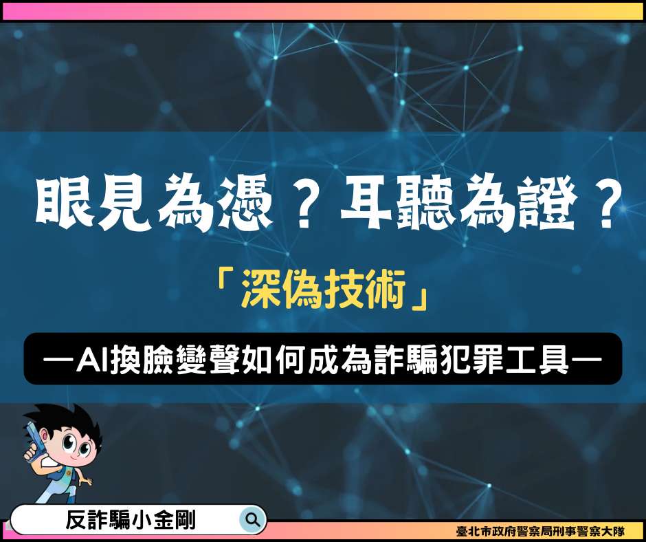隨著人工智慧發展,「深僞(Deepfake)」技術恐遭有心人士利用於假訊息、影片、語音等媒體素材合成製作,達到「換臉、變聲」等效果,甚至用於強化詐欺手法的擬真性,令民眾難辯真偽,因而受騙。