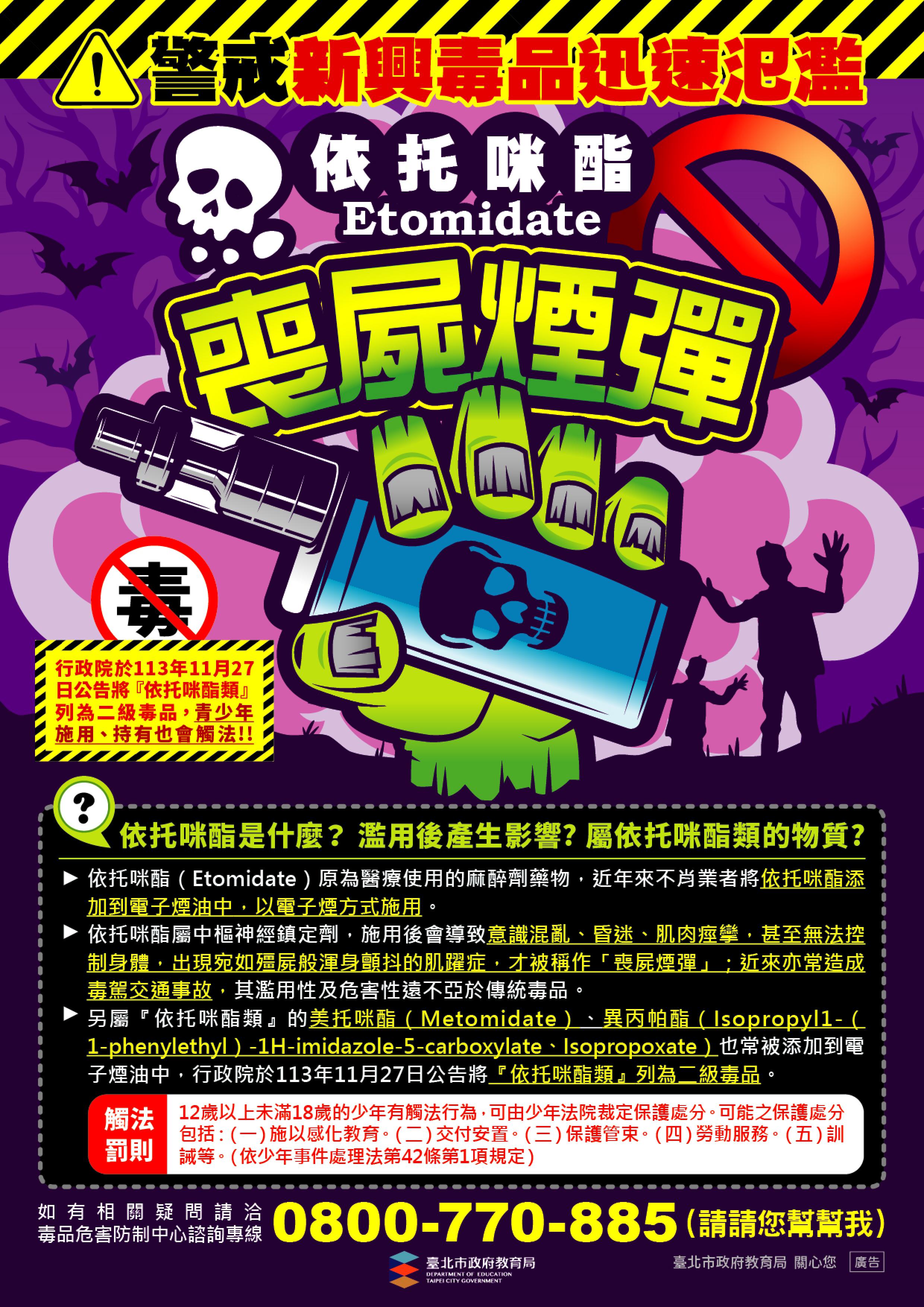 學生遠離毒害,教育局推出針對依托咪酯類毒品的宣導電子海報(EDM)向教師家長、學生提醒此毒品之危害及相關