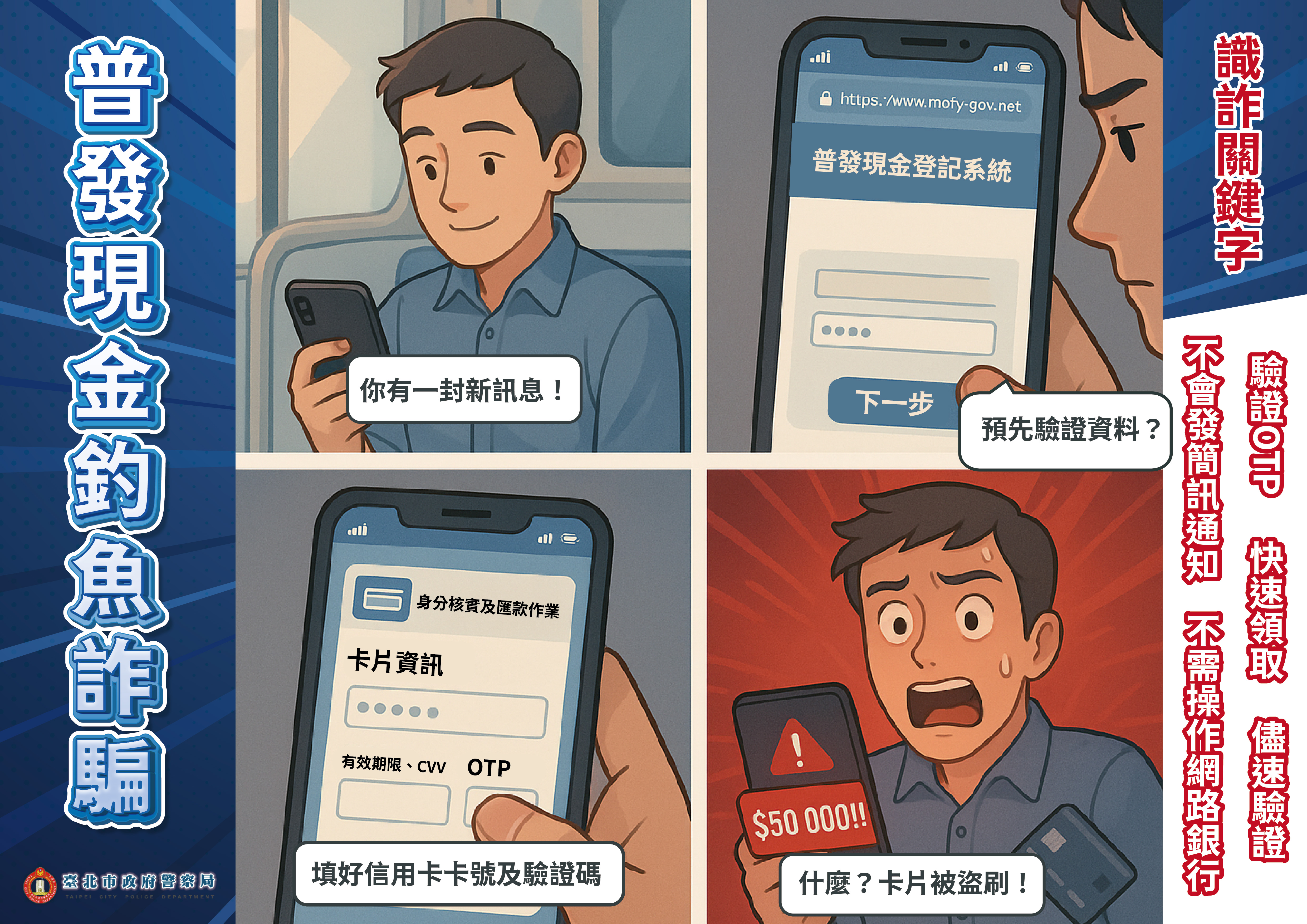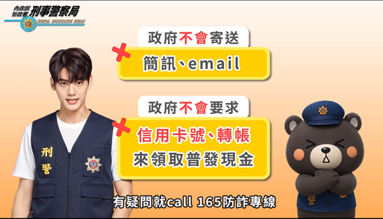全民普發現金,政府不會發簡訊或電子郵件要求登錄,更不會要求操作ATM或網銀,不點擊、不填輸、不匯款、不轉傳!