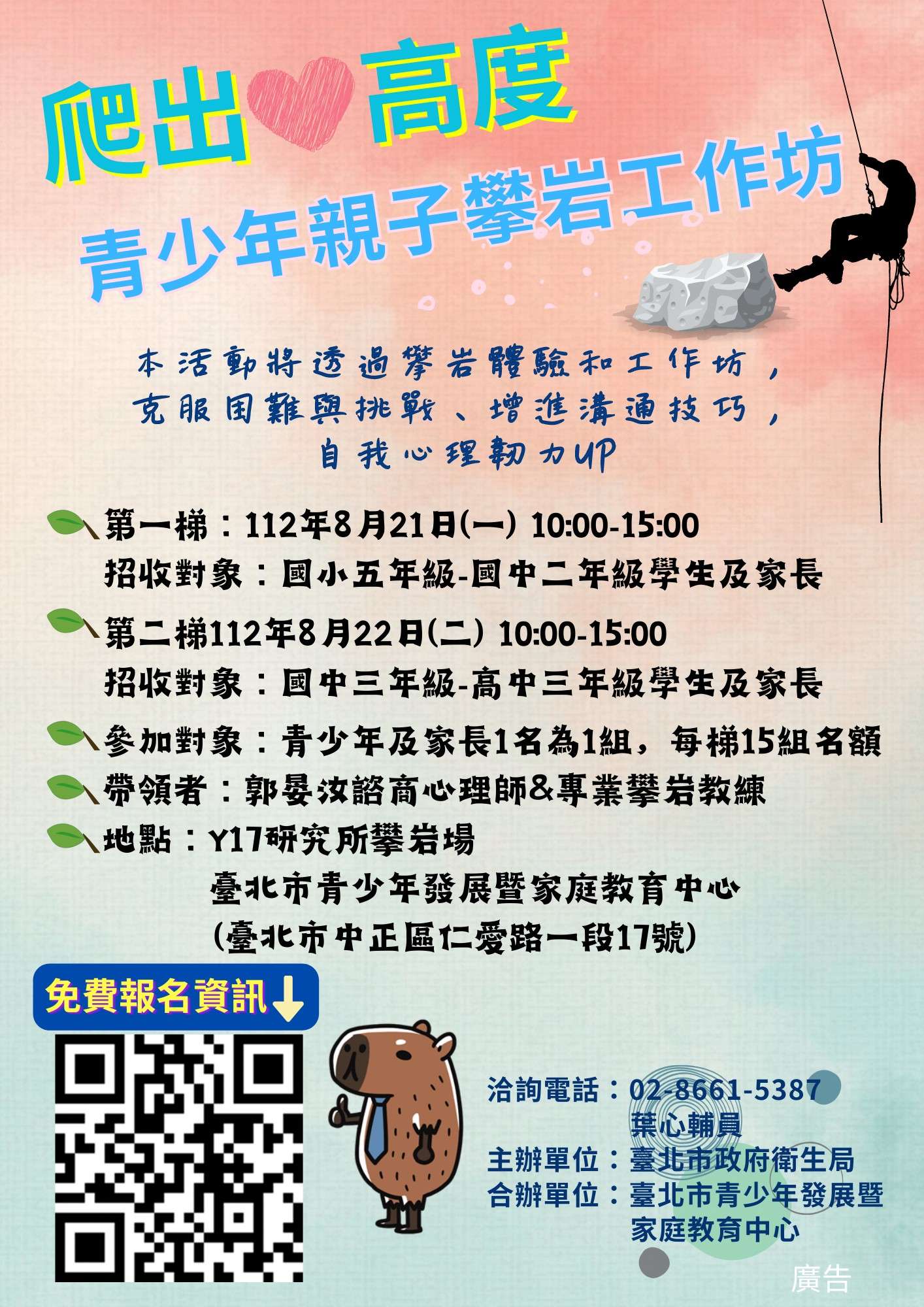 二、 為藉由冒險式體驗活動提升青少年心理韌性及促進親子互動品質,本局於8月辦理旨揭活動,共計2場次,活動資訊如下: