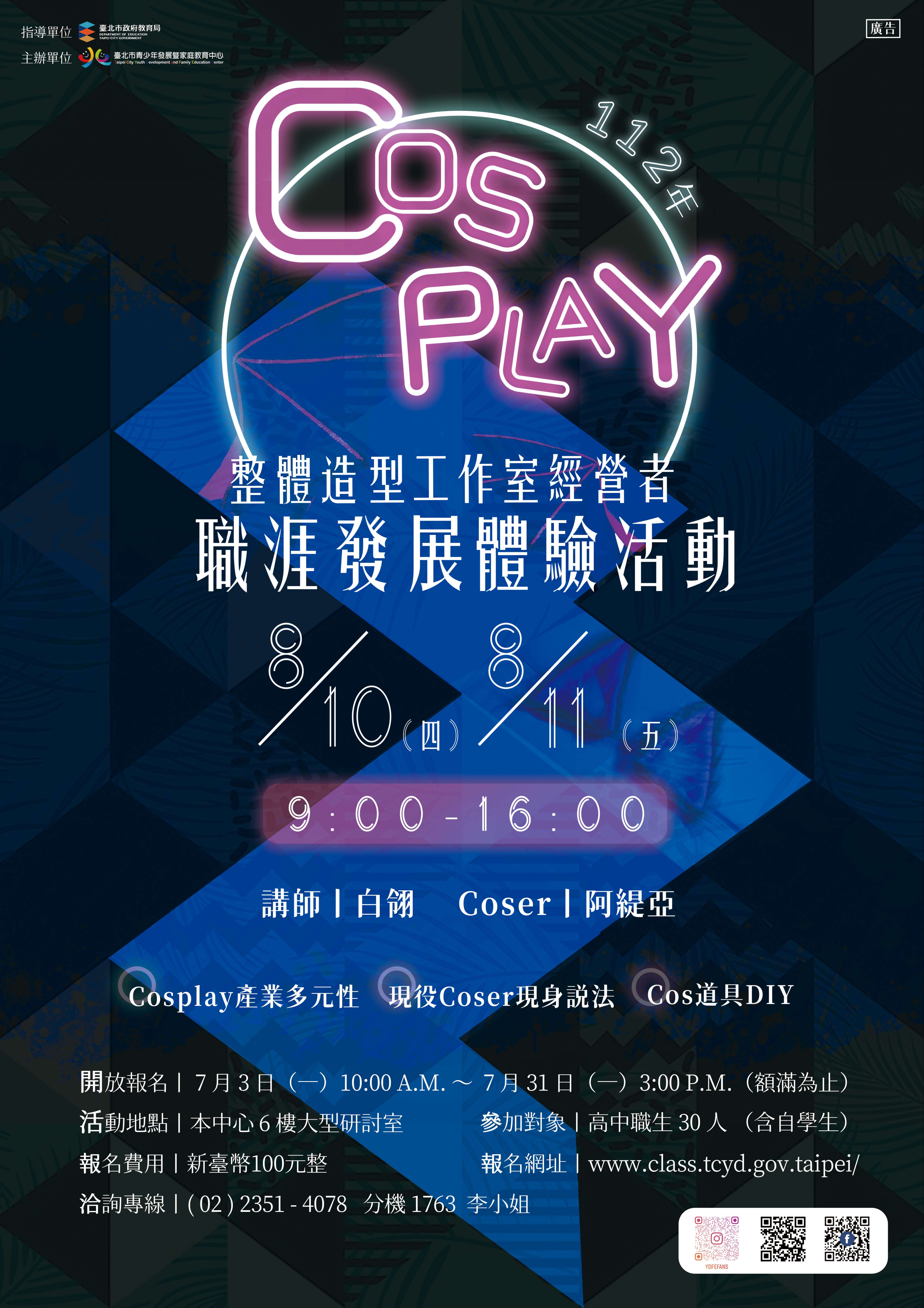 (六)辦理內容:透過探索Cosplay整體造型工作室經營者的工作歷程以及現役Coser經驗分享,