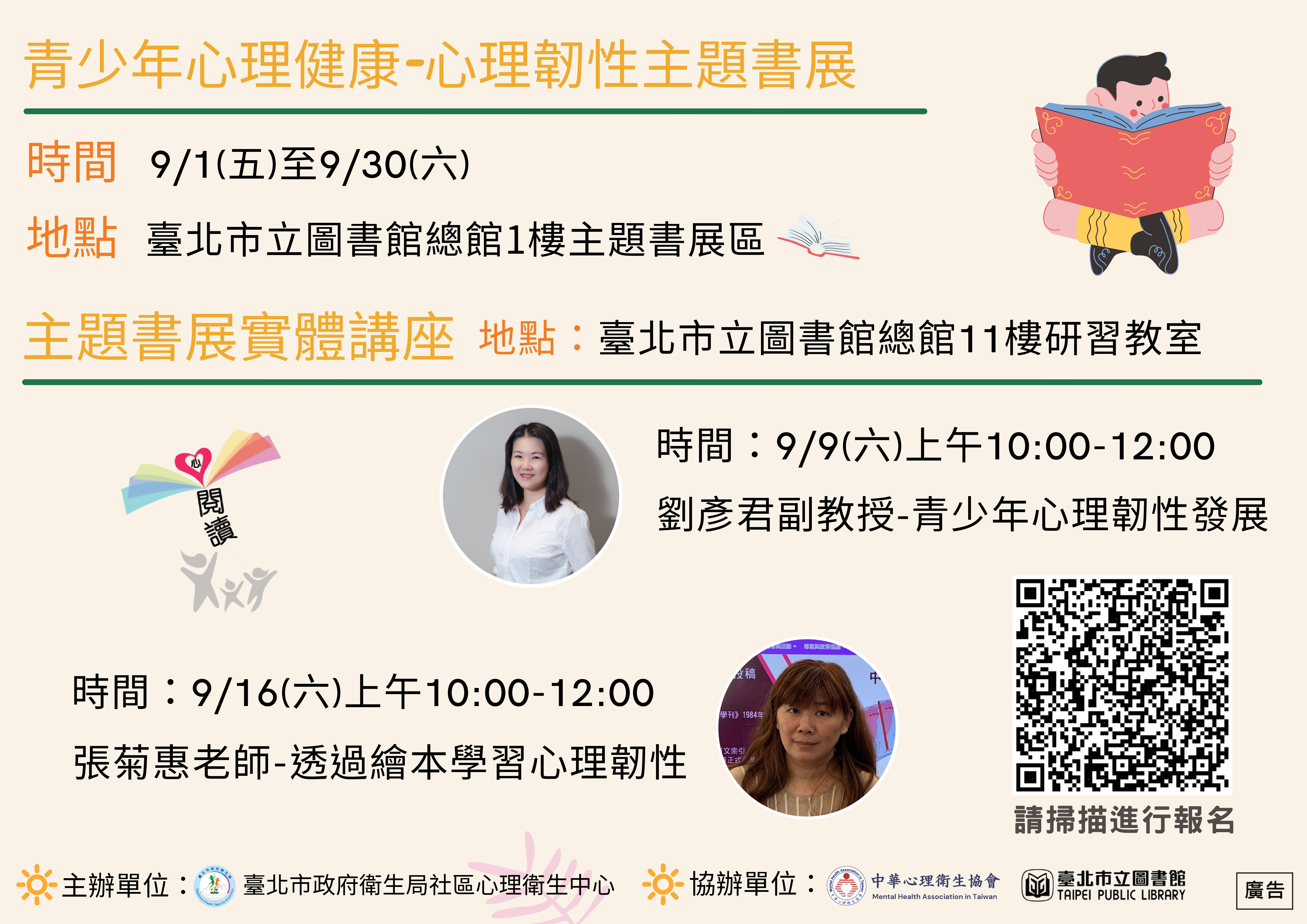 一、為促進青少年心理健康及注意力不足過動症相關知能,活動於8-9月辦理,活動資訊摘述如下: