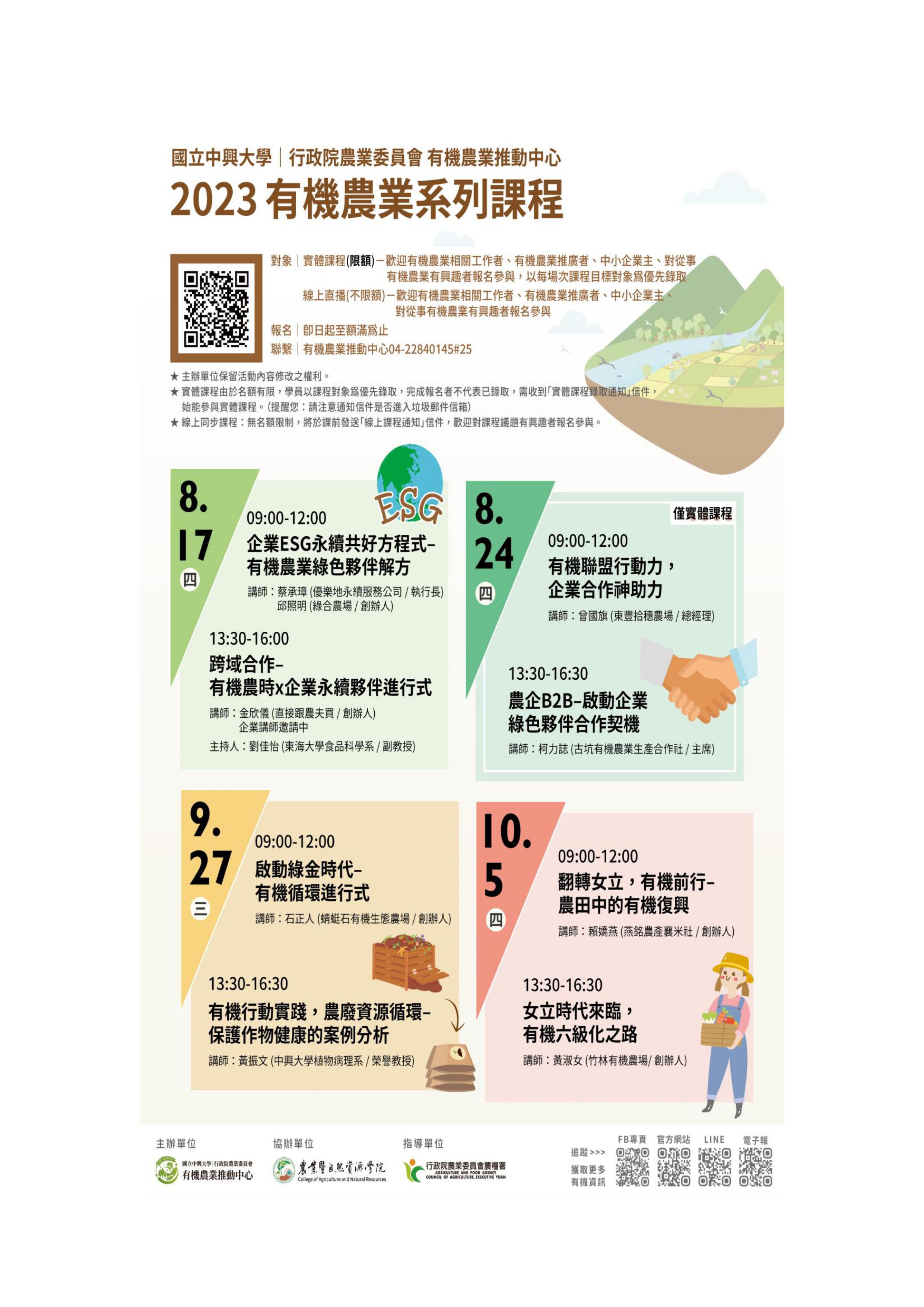 (三)報名方式:統一網路報名,實體課程名額有限,額滿為止;線上同步不限額(報名網址:https://www.oapc.org.tw/2023-0817_organic-knowledge/)。
