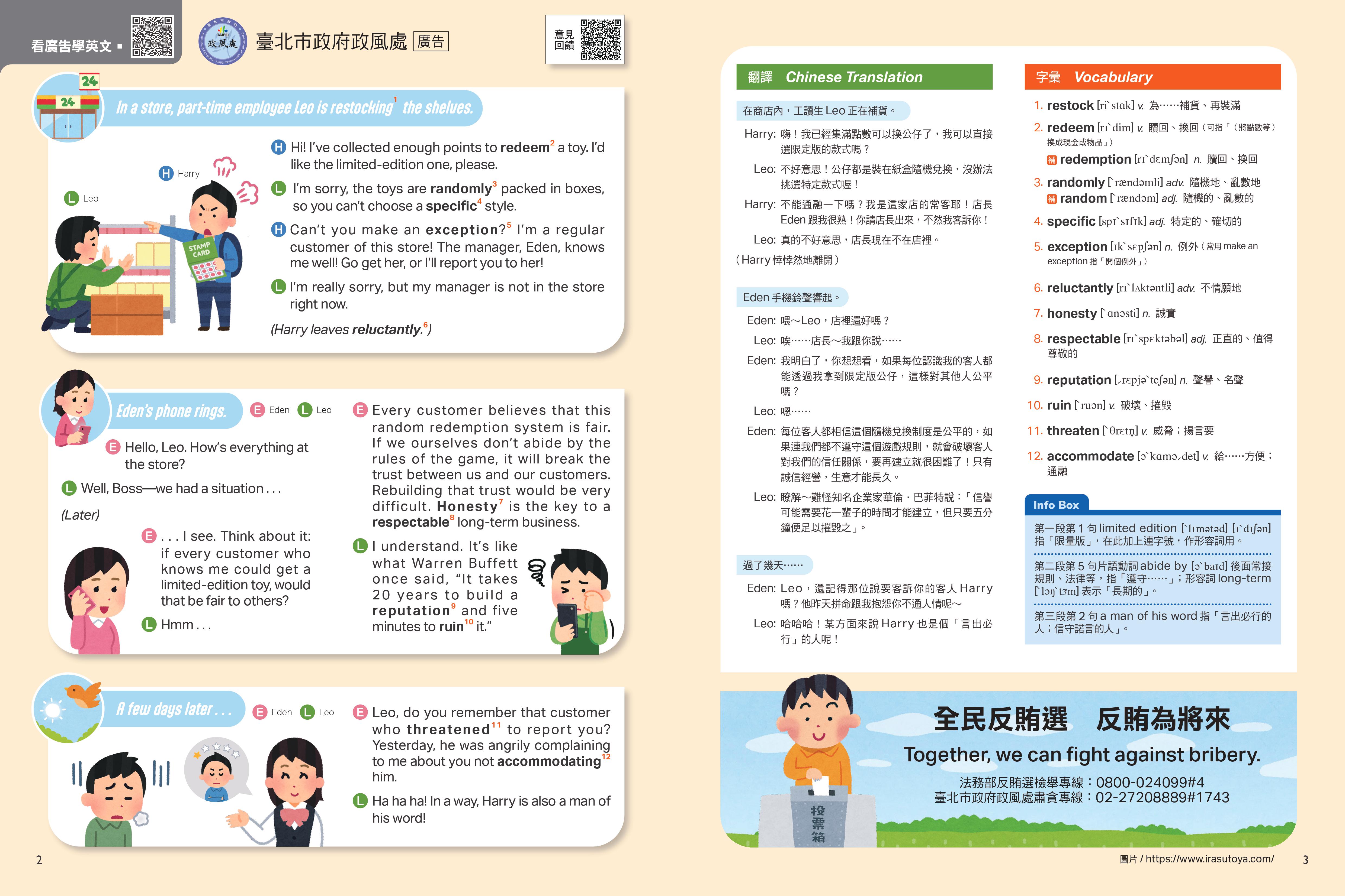 本府政風處與英語學習雜誌「Live互動英語雜誌」合作刊登跨頁英語誠信短篇故事(如附件),