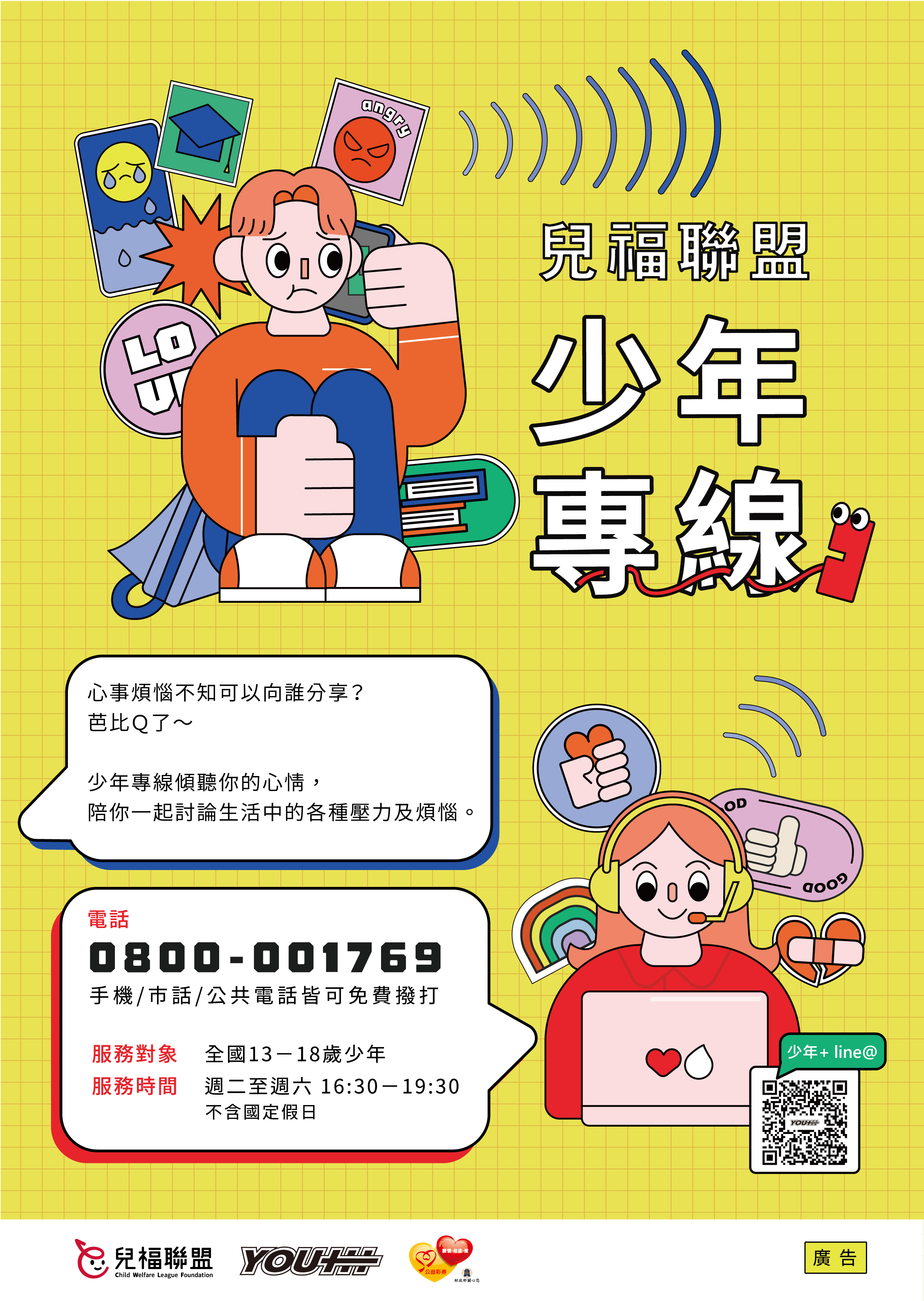 財團法人中華民國兒童福利聯盟文教基金會辦理「兒福聯盟-少年專線服務(0800-001769)」, 提供全台12歲至18歲之少年免付費電話諮詢服務,服務時間為每週二至週六下午4:30至7:30。期待透過此專線傾聽少年的需求,協助其抒發壓力,並引導、陪伴他們面對和解決困難。