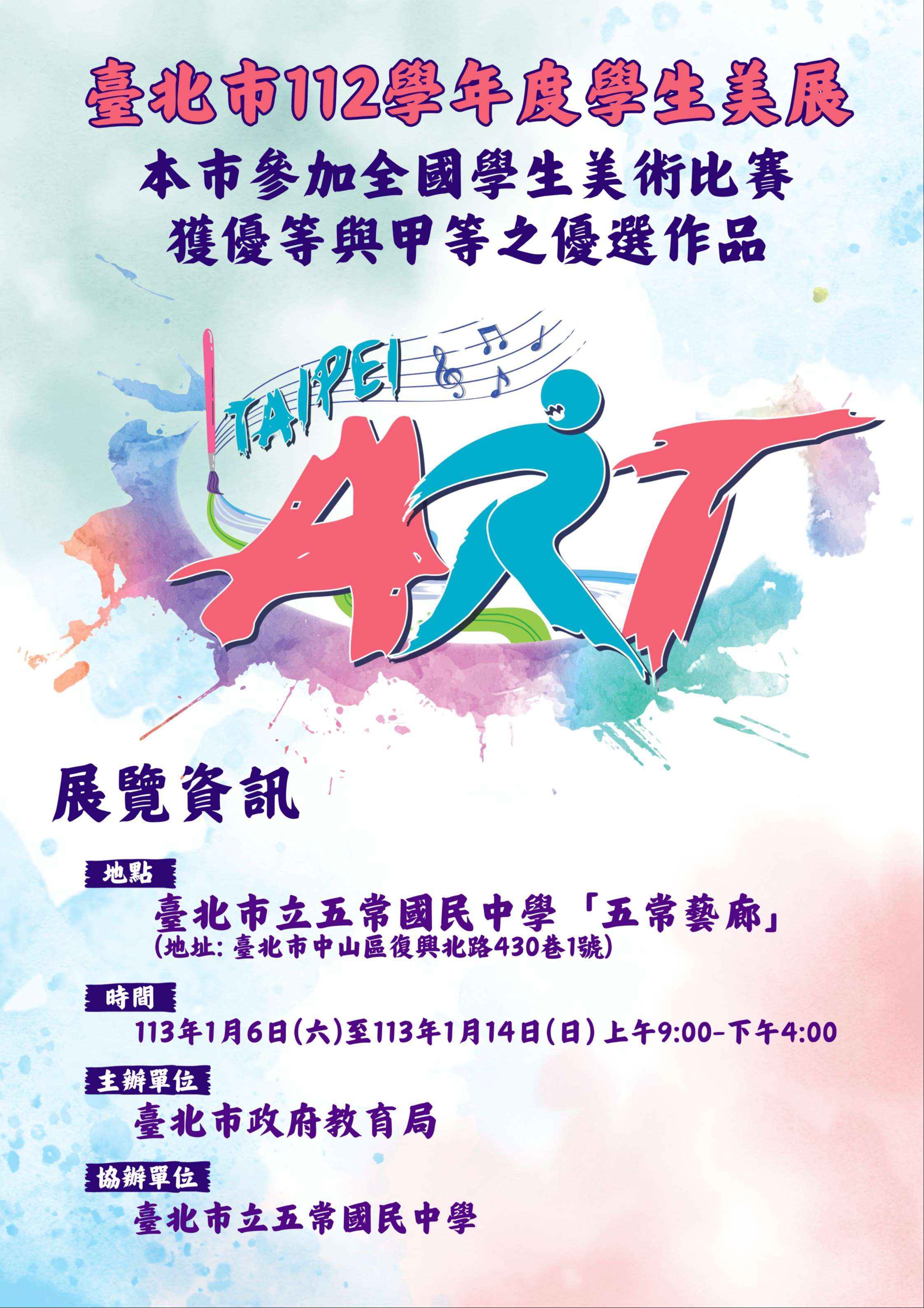(一)展出地點:臺北市立五常國民中學「五常藝廊」(地址:臺北市中山區復興北路430巷1號)。