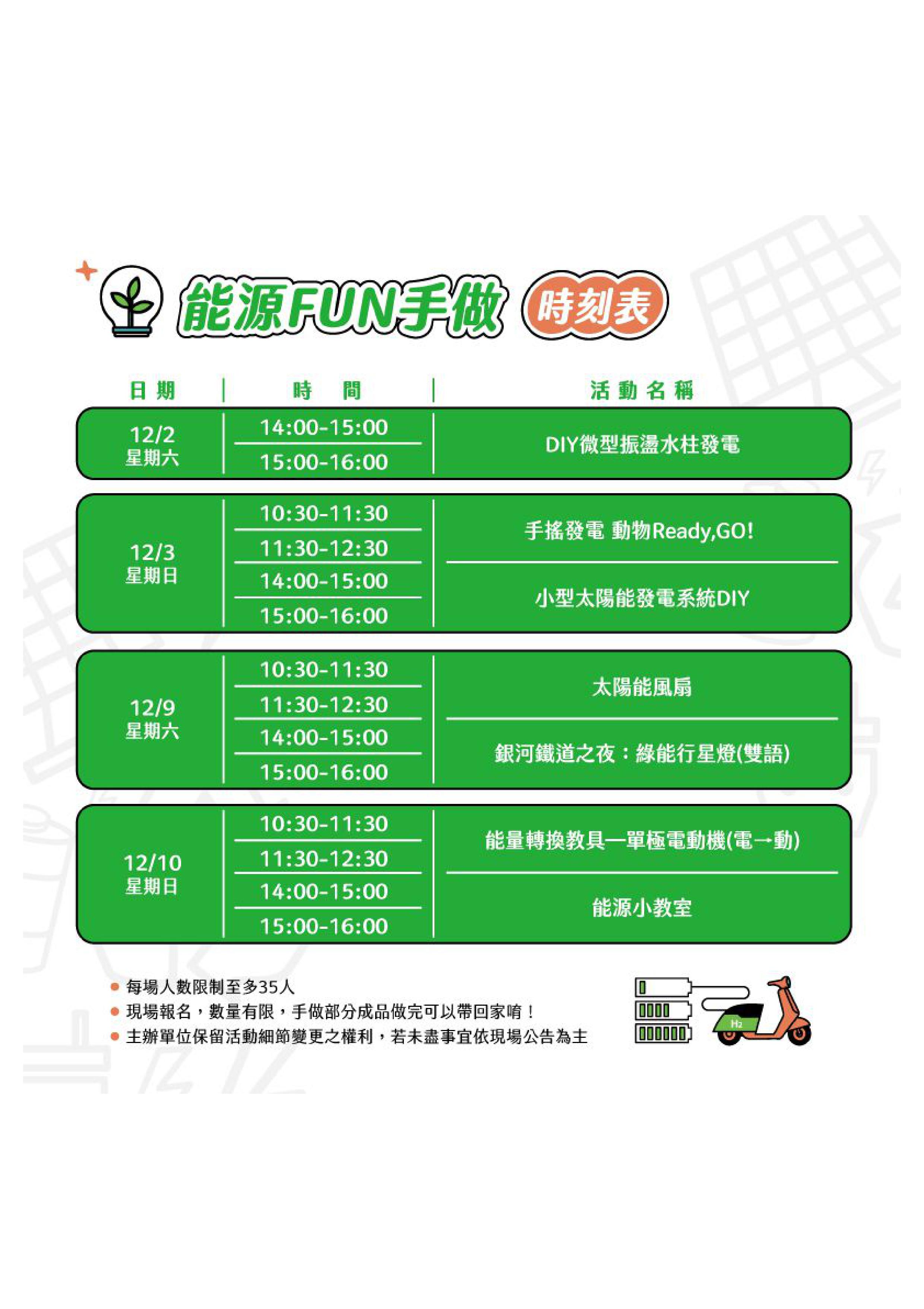 二、 展示內容除各參展單位之執行成果外,更包含多項能源科技實驗教具,現場設有能源科技動手做活動、能源教具闖關活動,富含環境教育意義,適合各年齡層師生及民眾參與體驗。