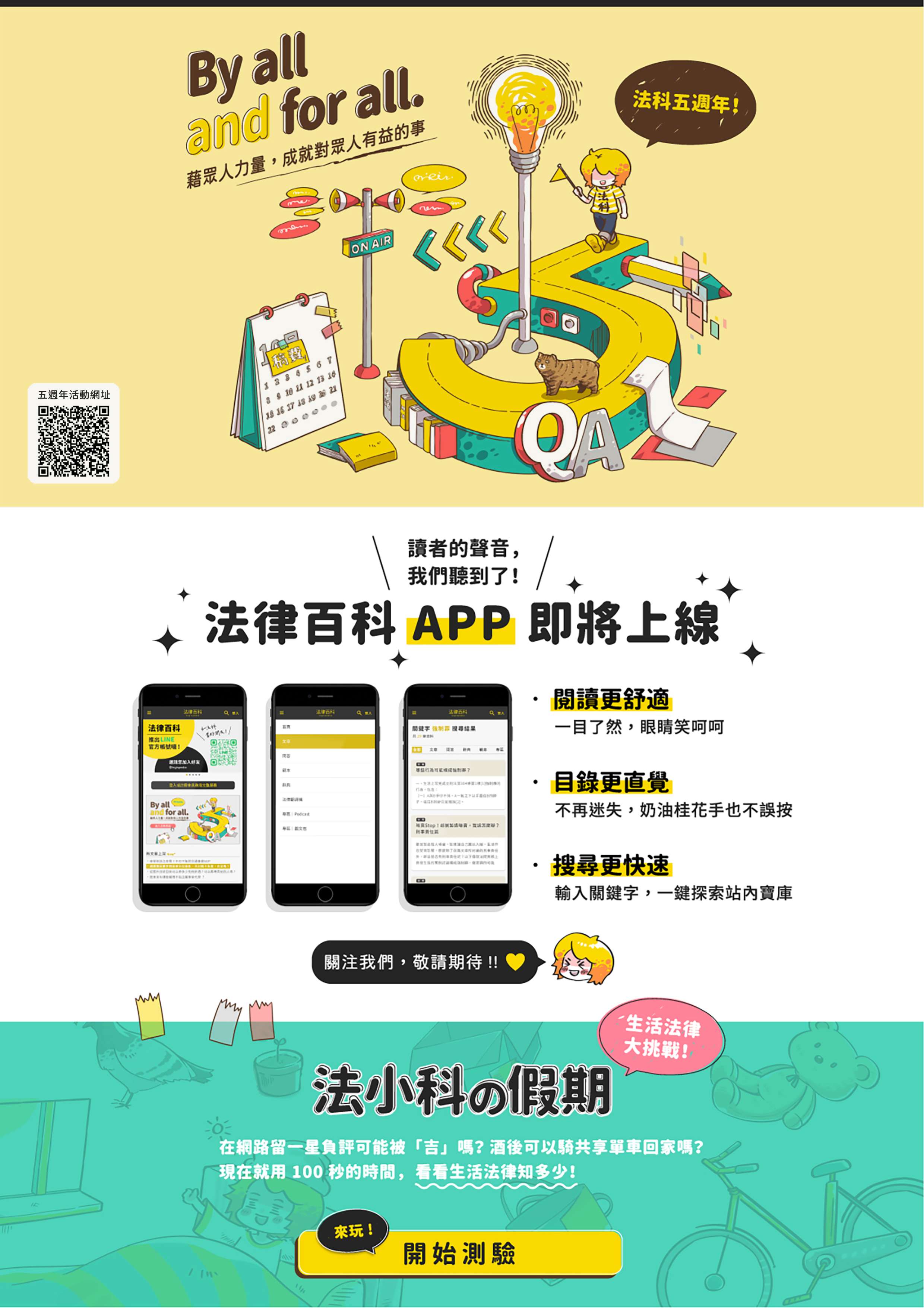 「法律百科」APP可透過手機應用程式商店免費下載利用;《法小科の假期》線上互動遊戲即日起至民國113年4月17日止,
