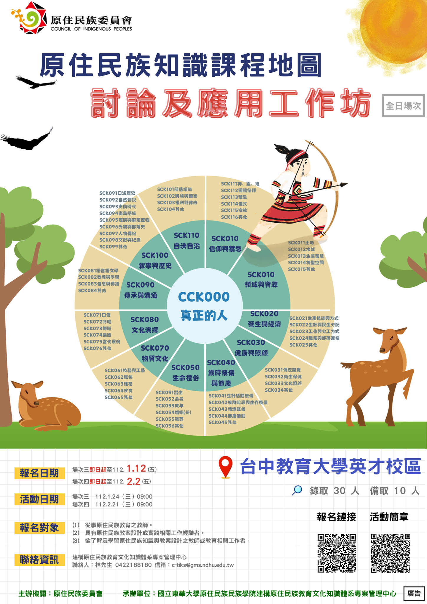 國立東華大學於113年1月24日(星期三)、2月21日(星期三)辦理「112年度原住民族知識課程地圖討論及應用工作坊」報名簡章及活動海報,請踴躍報名。