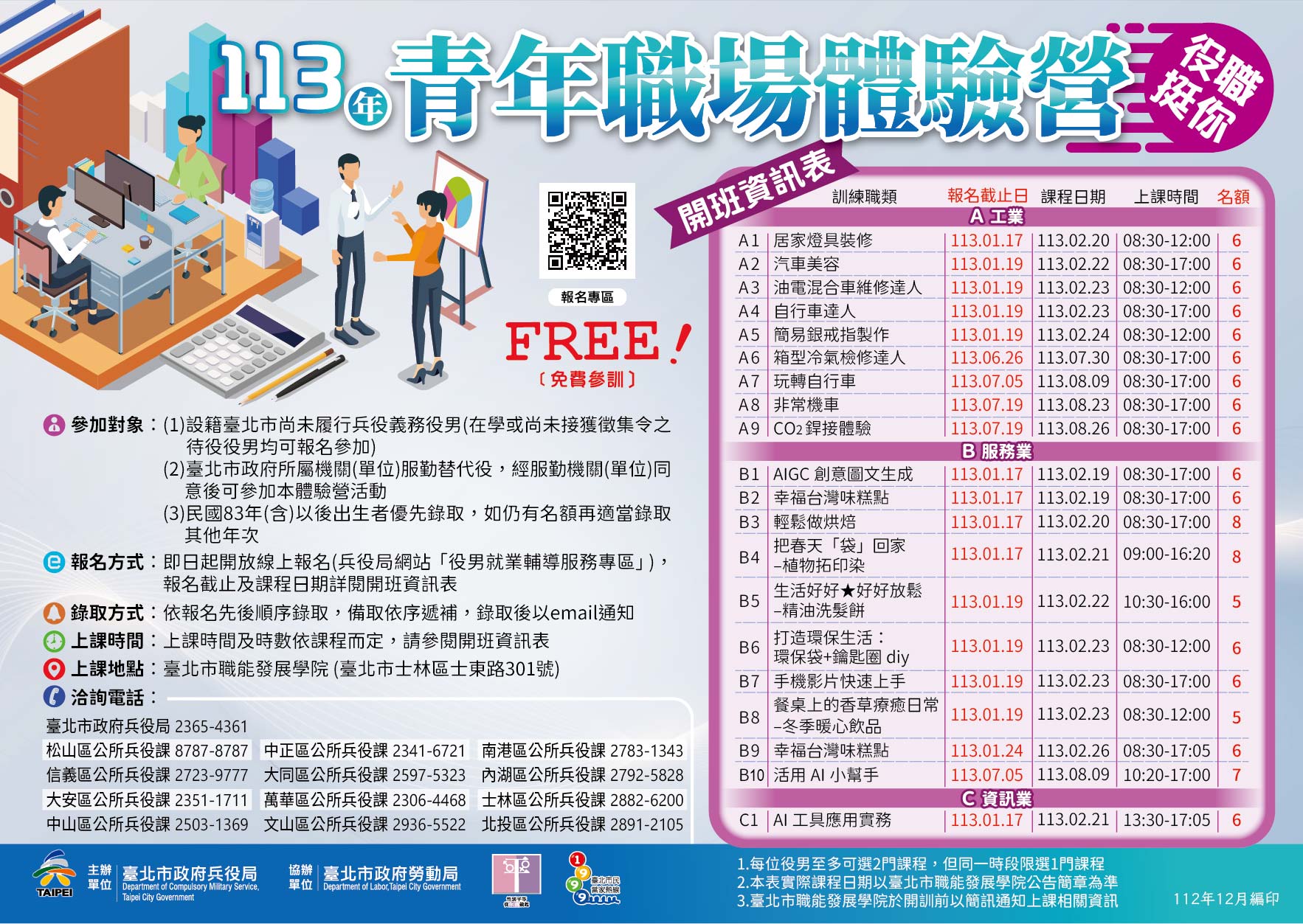 體驗營規劃自113年2至8月共開設20班課程,每班提供5至8位名額予役男報名,每班訓期4至8小時不等,每位役男至多可選2門課程,但同一時段限選1門課程。