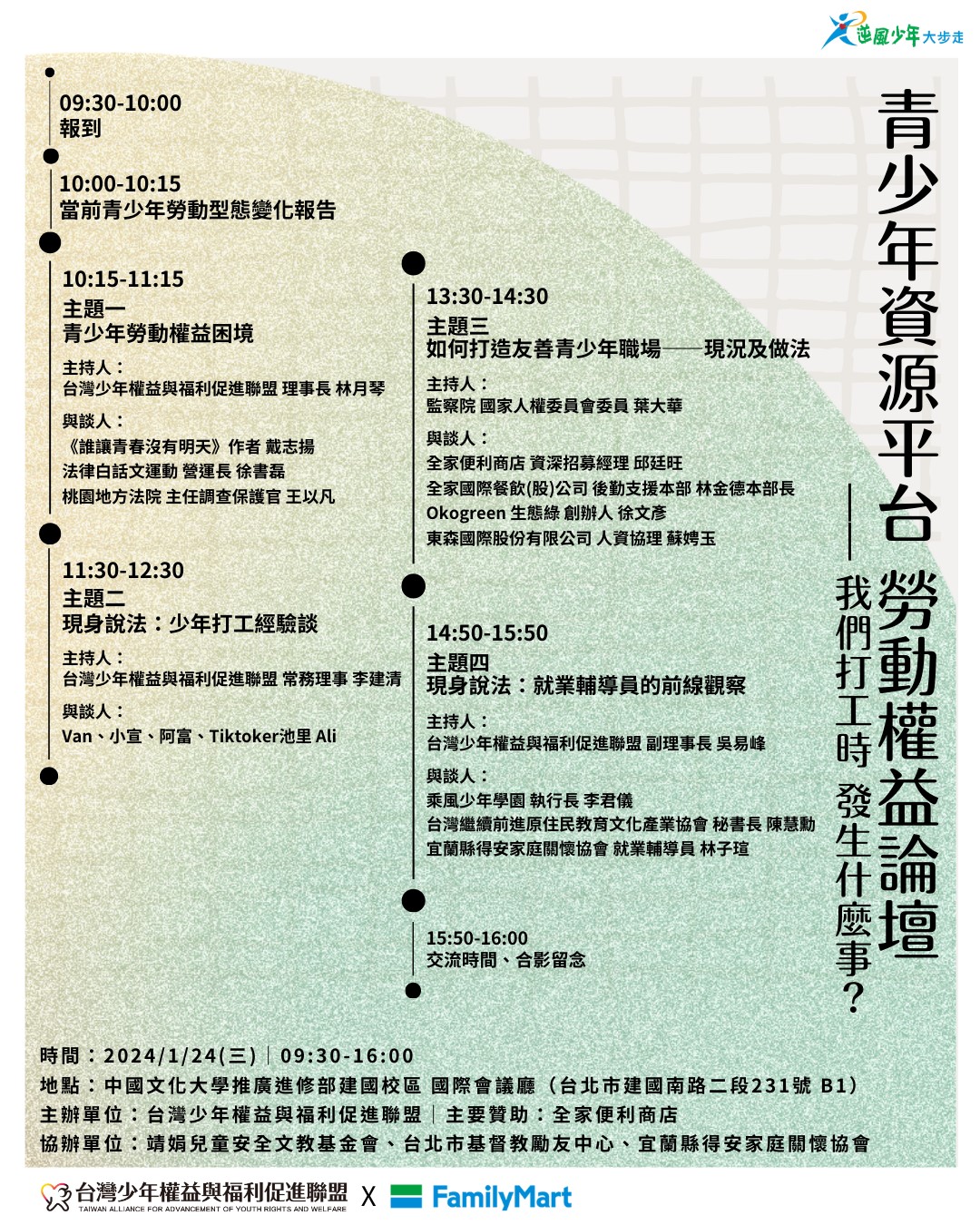 參與對象:80-100 人。預計邀請:青少年、勞動與司法專家、社福工作者、就業輔導人員、社工、學校教師、輔導老師、政府部門相關業務人員、青少年家長。