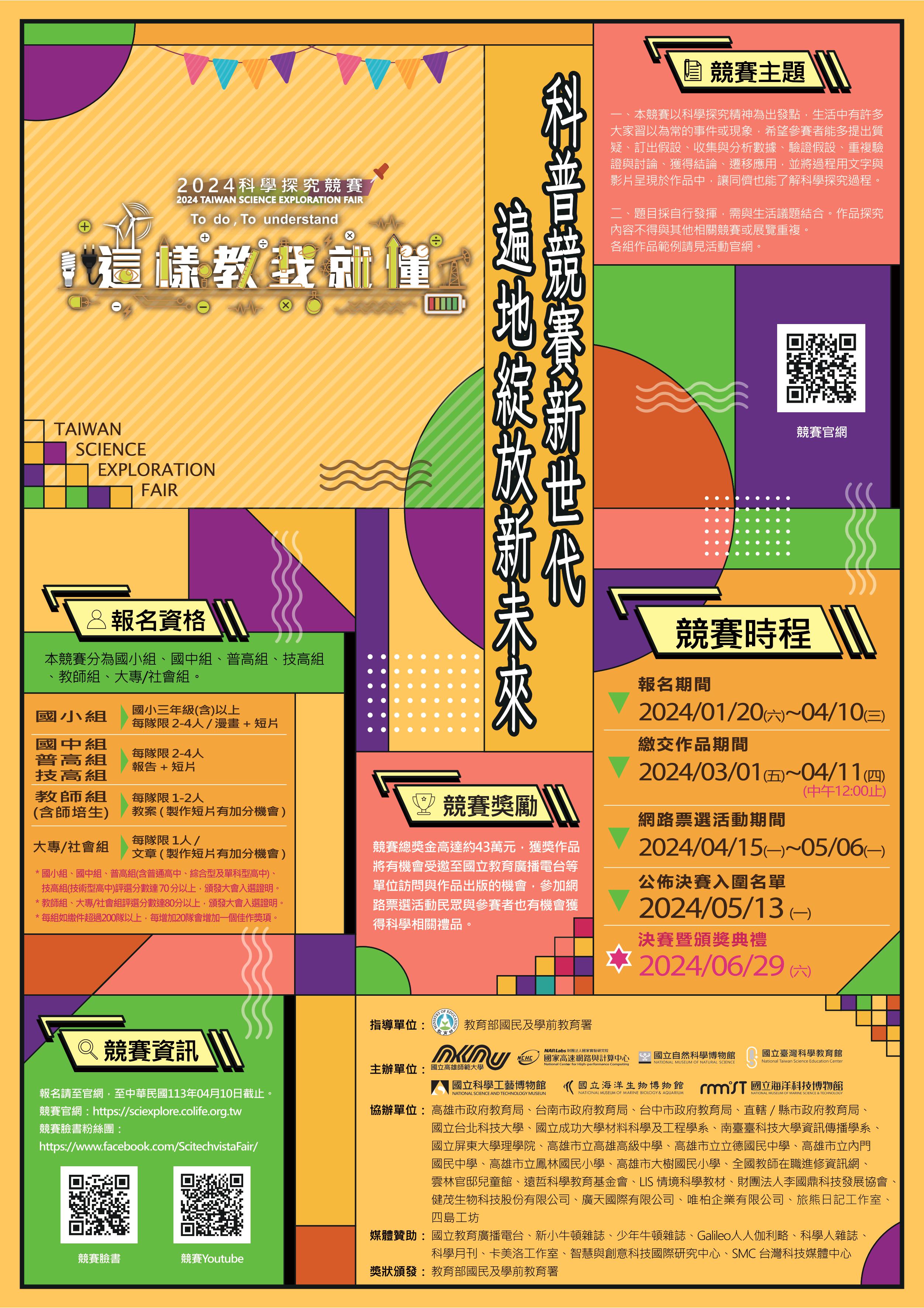報名資訊、競賽方式與獎勵等相關資訊,請參閱附件或計畫網站(官網:http://sciexplore.colife.org.tw/;