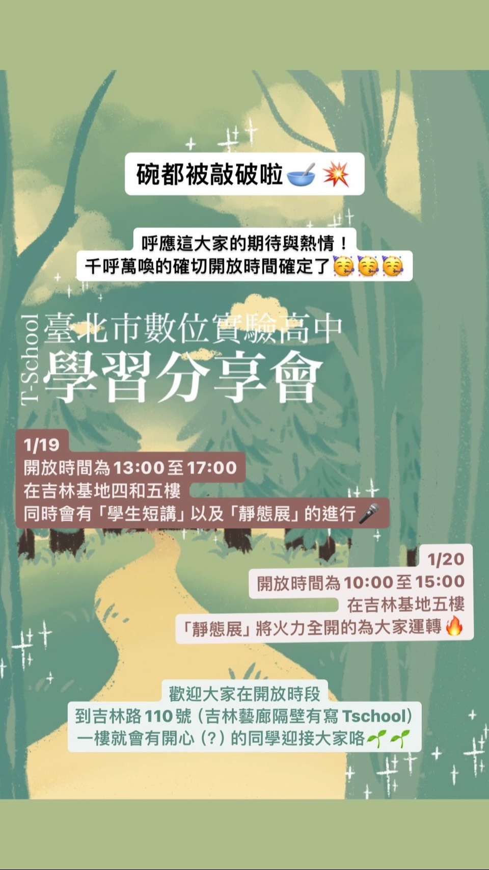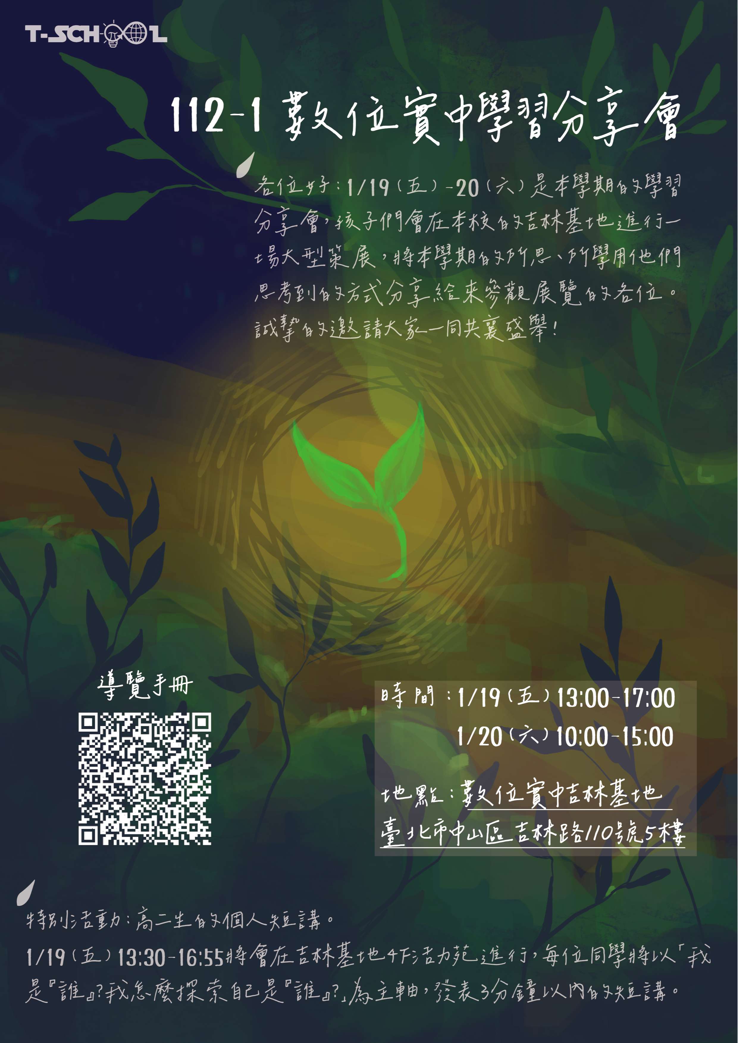 1/19(五)-20(六)是本學期的學習分享會,孩子們會在本校的吉林基地進行一場大型策展,將本學期的所思、所學用他們思考到的方式分享給來參觀展覽的各位。誠摯的邀請大家一同共襄盛舉!