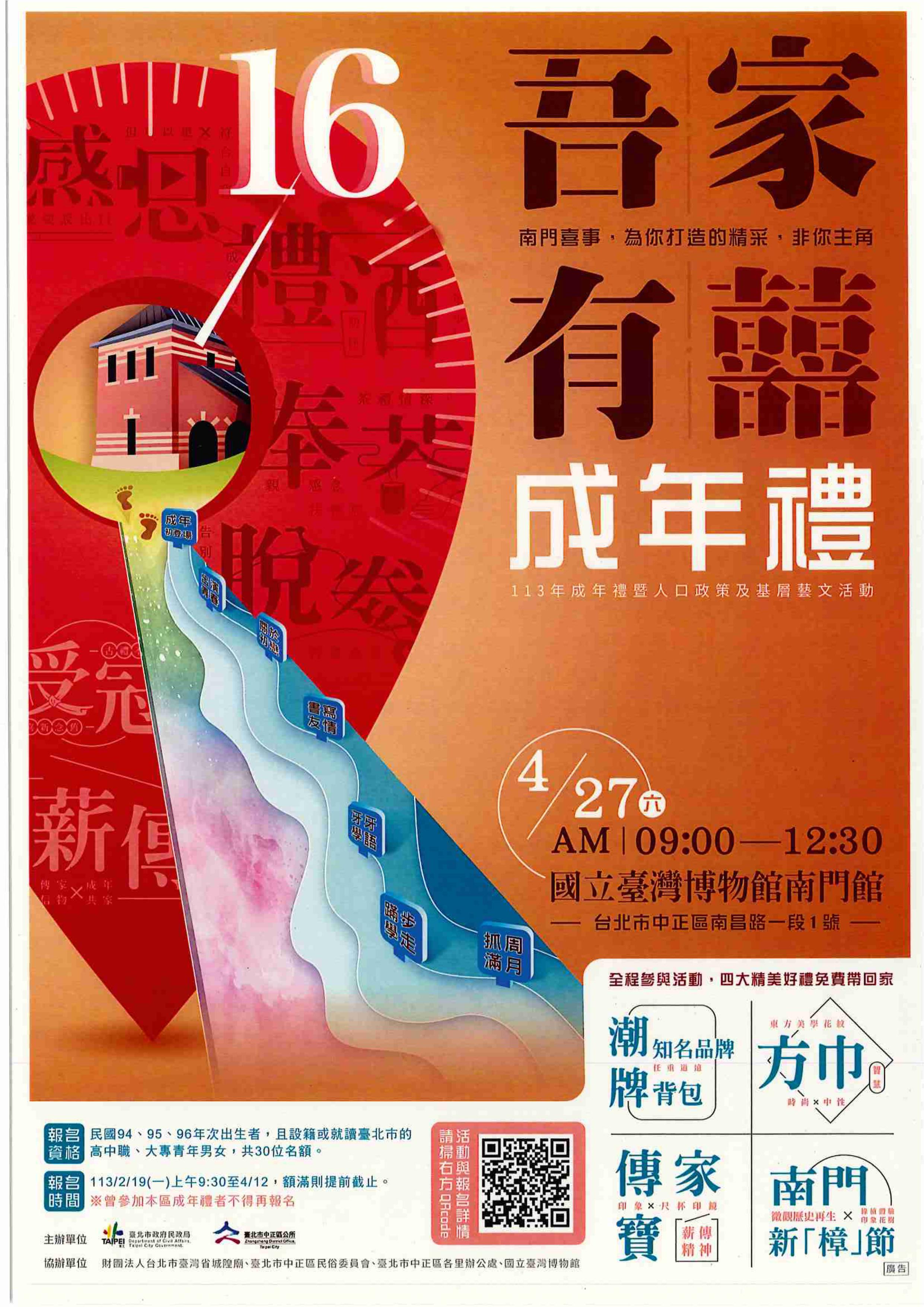 (曾參加本區成年禮者不得再報名)報名網址:https://www.accupass.com/event/2401150634559510726940,或掃描海報QR CODE連結網址。