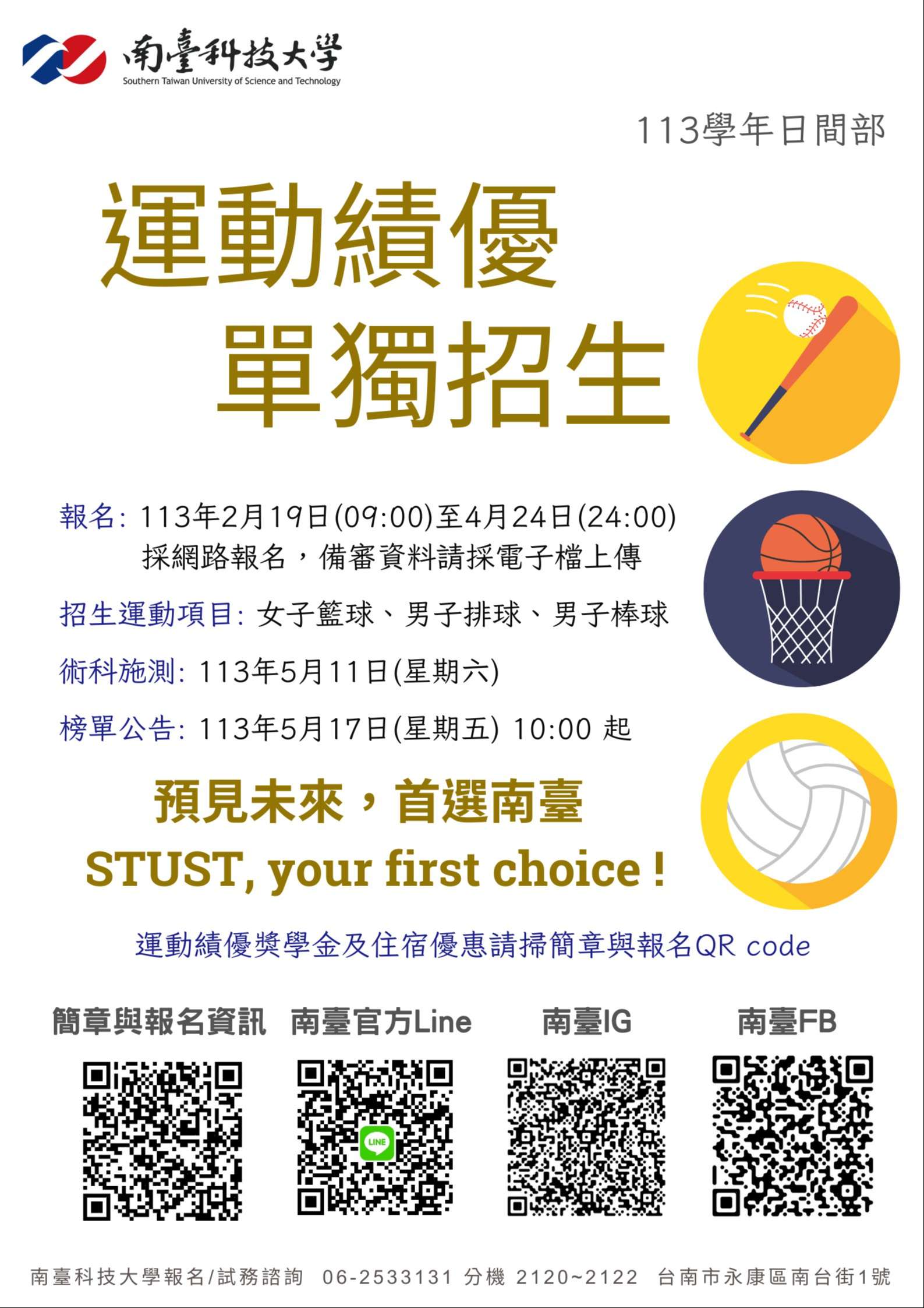 一、南臺科技大學於113學年度招收男子棒球、男子排球、女子籃球之運動績優學生,招生系所、報名及考試相關資訊,請參閱附件之招生簡章、海報。