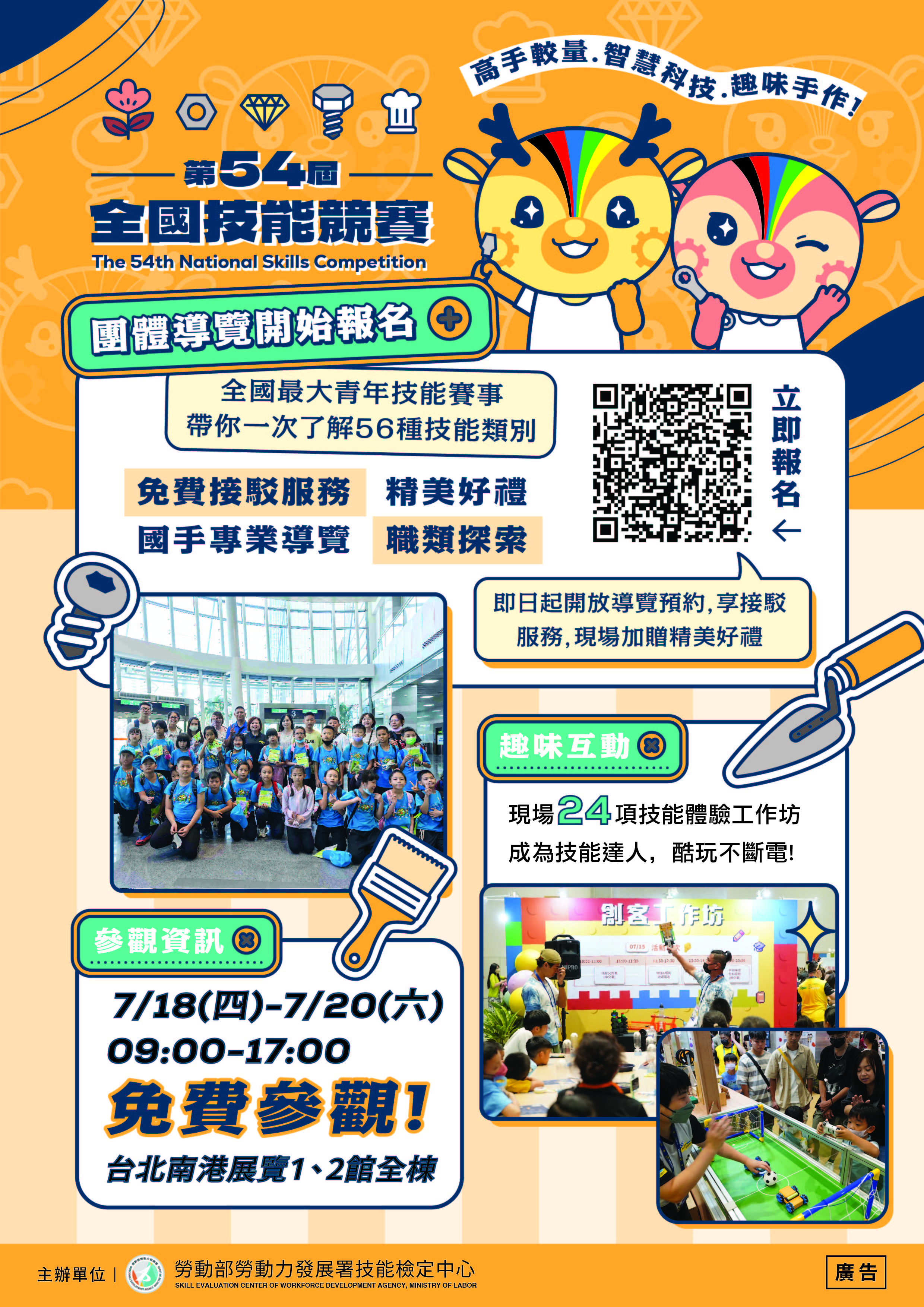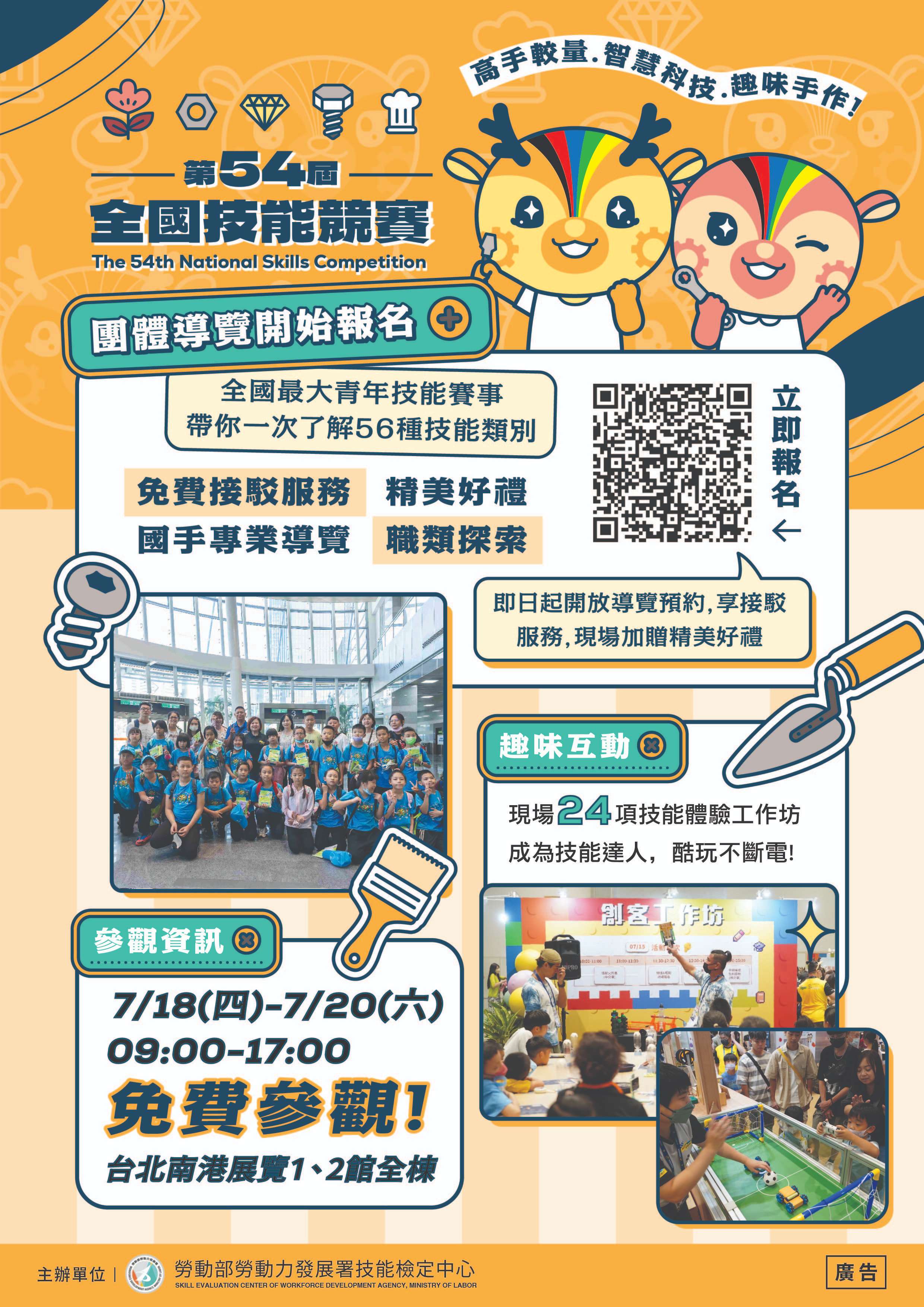 旨揭競賽活動訂於113年7月18日(星期四)至7月20日(星期六)假臺北市南港展覽館1、2館(臺北市南港區經貿二路1、2 號)舉辦,本次辦理青年組56職類與青少年組13職類,