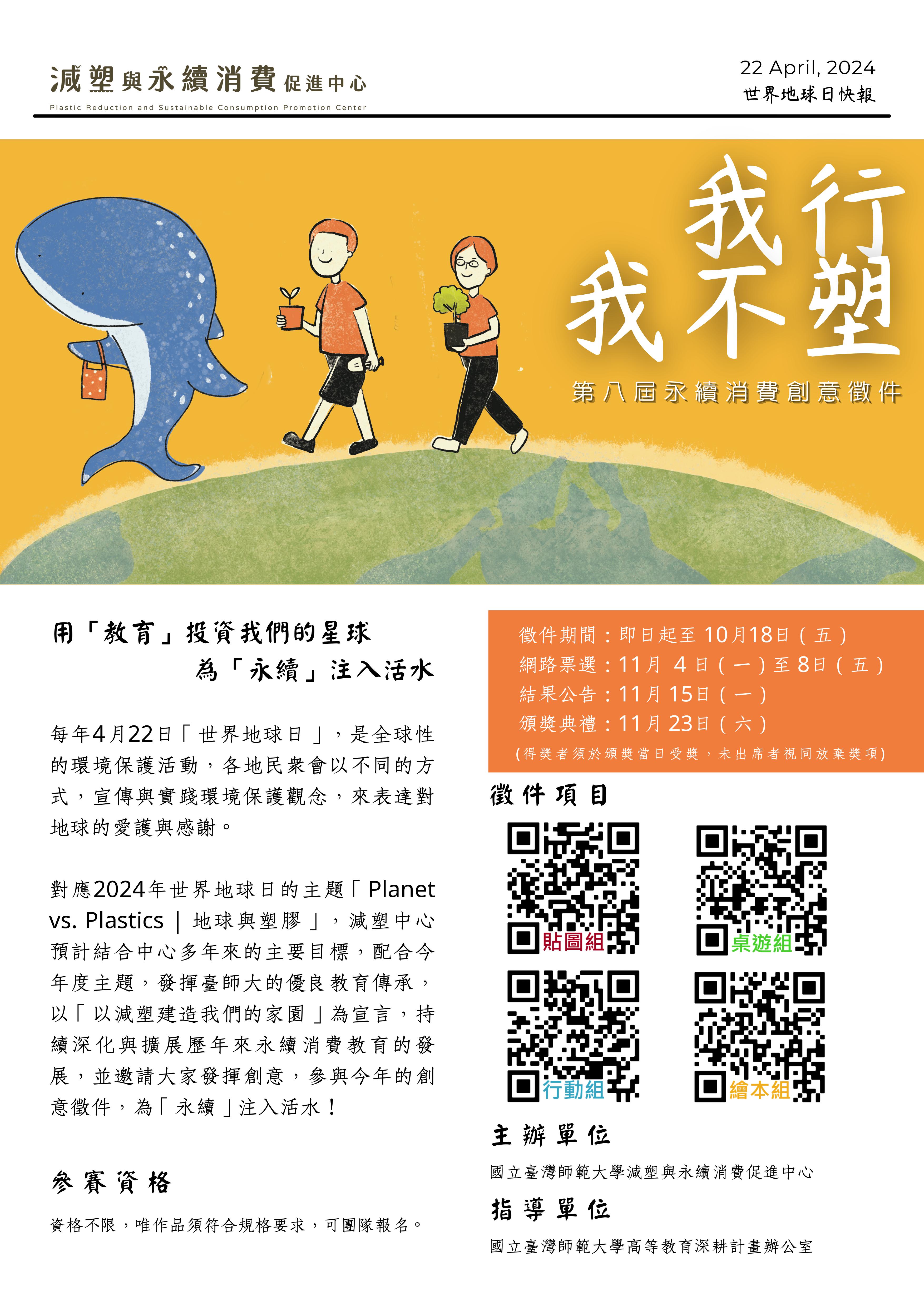 活動宗旨:旨揭活動為臺師大減塑與永續消費促進中心辦理「2024年我行!我不塑!」競賽,期許透過大眾的實際參與,共同營造友善環境,建立生命共構、維護生態具永續消費價值的幸福生活網。