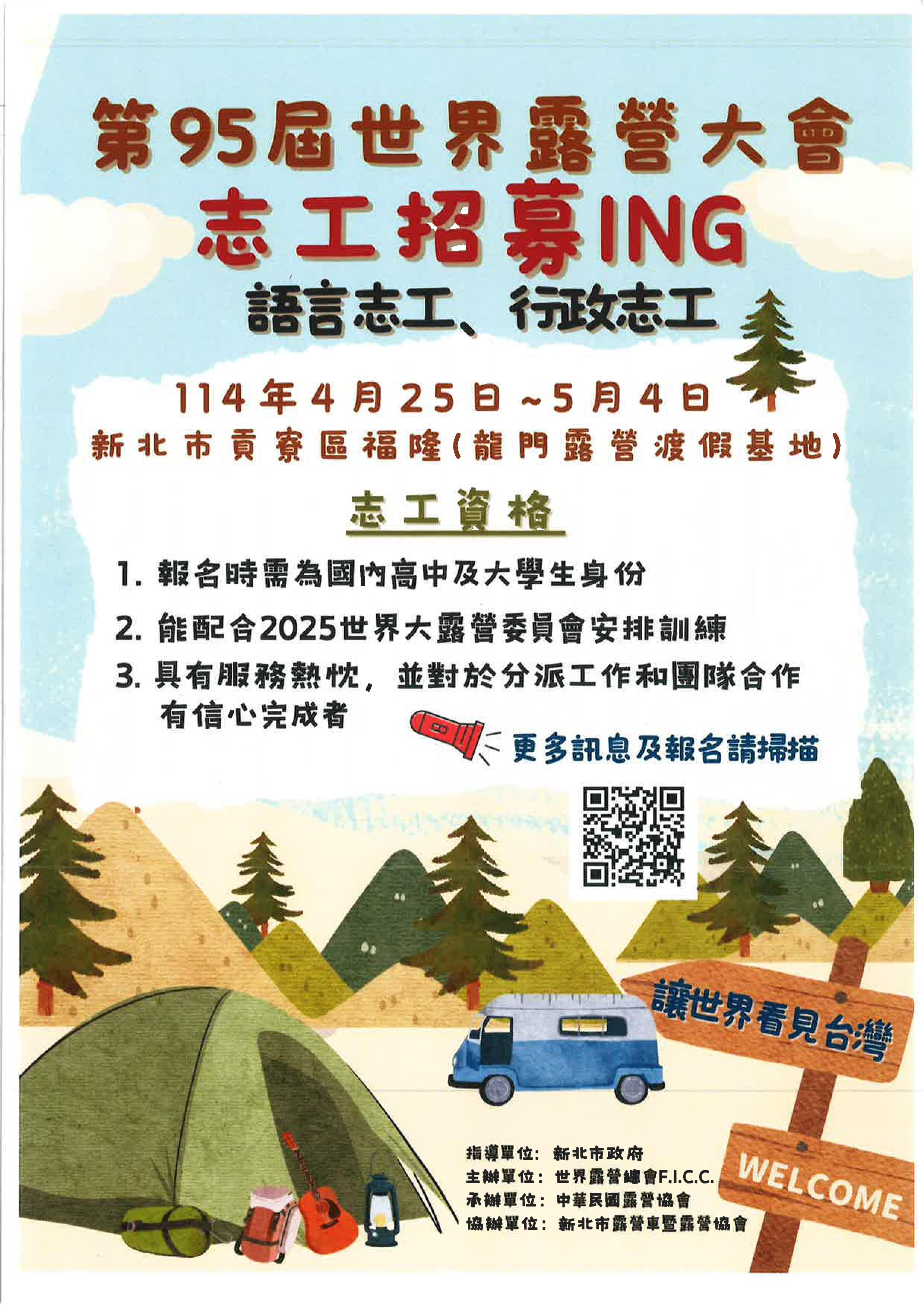 二、第95屆世界露營大會將於114年4月25日至5月4日於新北市貢寮區福隆龍門露營度假基地舉辦,新北市露營暨露營車協會廣邀國內高中及大專院校學生加入志工服務,讓來自世界各地的人可以看見臺灣好和美。