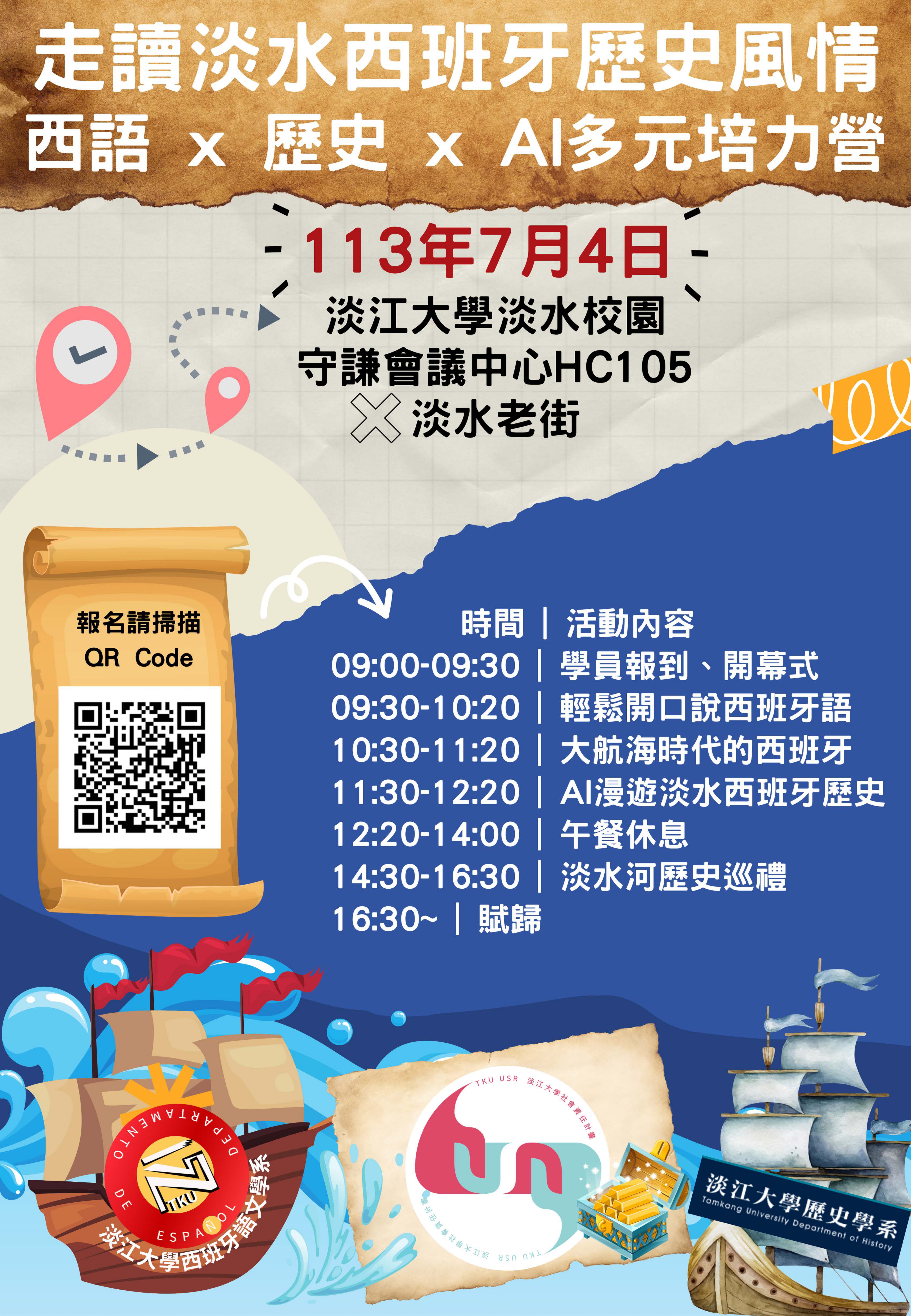 五、報名方式:採網路報名,自113年6月1日上午10時起至113 年6月20日晚上10時止,至活動報名系統(網址:reurl.cc/vaKjoL)登錄報名,關鍵字請查詢「西班牙歷史風情」。