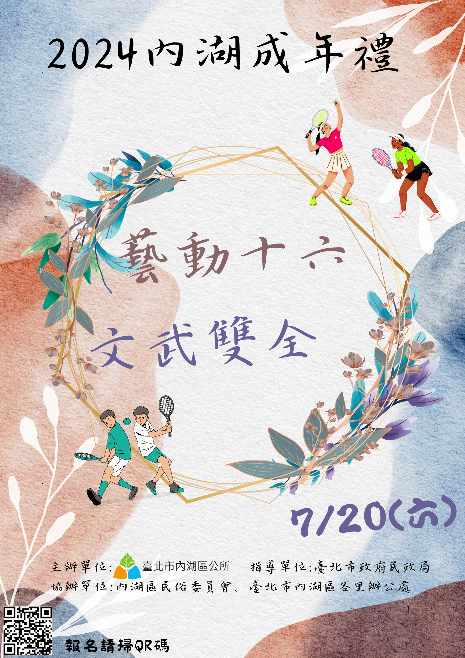 一、內湖區公所113年7月20日成年禮活動,內容包含新住民表演、手作體驗、成年禮儀式及任天堂Switch互動遊戲,歡迎設籍或就讀於臺北市之青年男女(民國95、96、97年次)踴躍報名參加。」