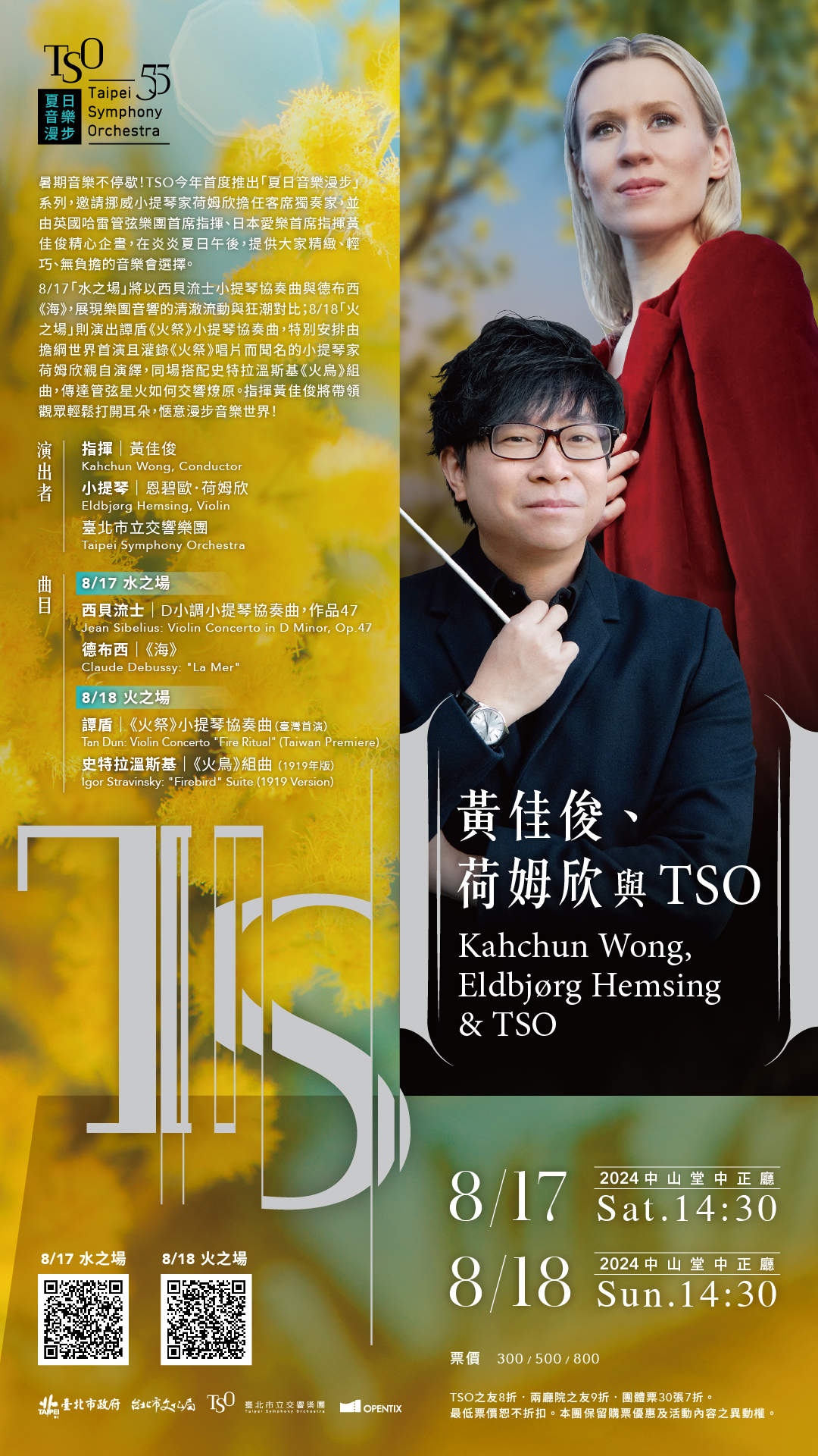 一、黃佳俊、荷姆欣與TSO(水之場、火之場)音樂會係本團 今年推出之全新【TSO夏日音樂漫步】系列活動,特別邀請現任日本愛樂交響樂團首席指揮黃佳俊(Kahchun Wong),攜手挪威小提琴家恩碧歐·荷姆欣(Eldbjørg Hemsing)同臺演出,這次全新設計輕巧的音樂會內容,只 需一段悠閒的下午茶時間,無中場休息加上指揮分享,輕鬆欣賞古典音樂,提供夏日午後另一種休閒選擇。本次音樂會公務人員享有八折優惠、學生享有購票七折優惠,歡迎蒞臨聆賞。水之場演出資訊:https://s.opentix.life/p/P649b8b59、火之場演出資訊:https://s.opentix.life/p/P70e3701b。