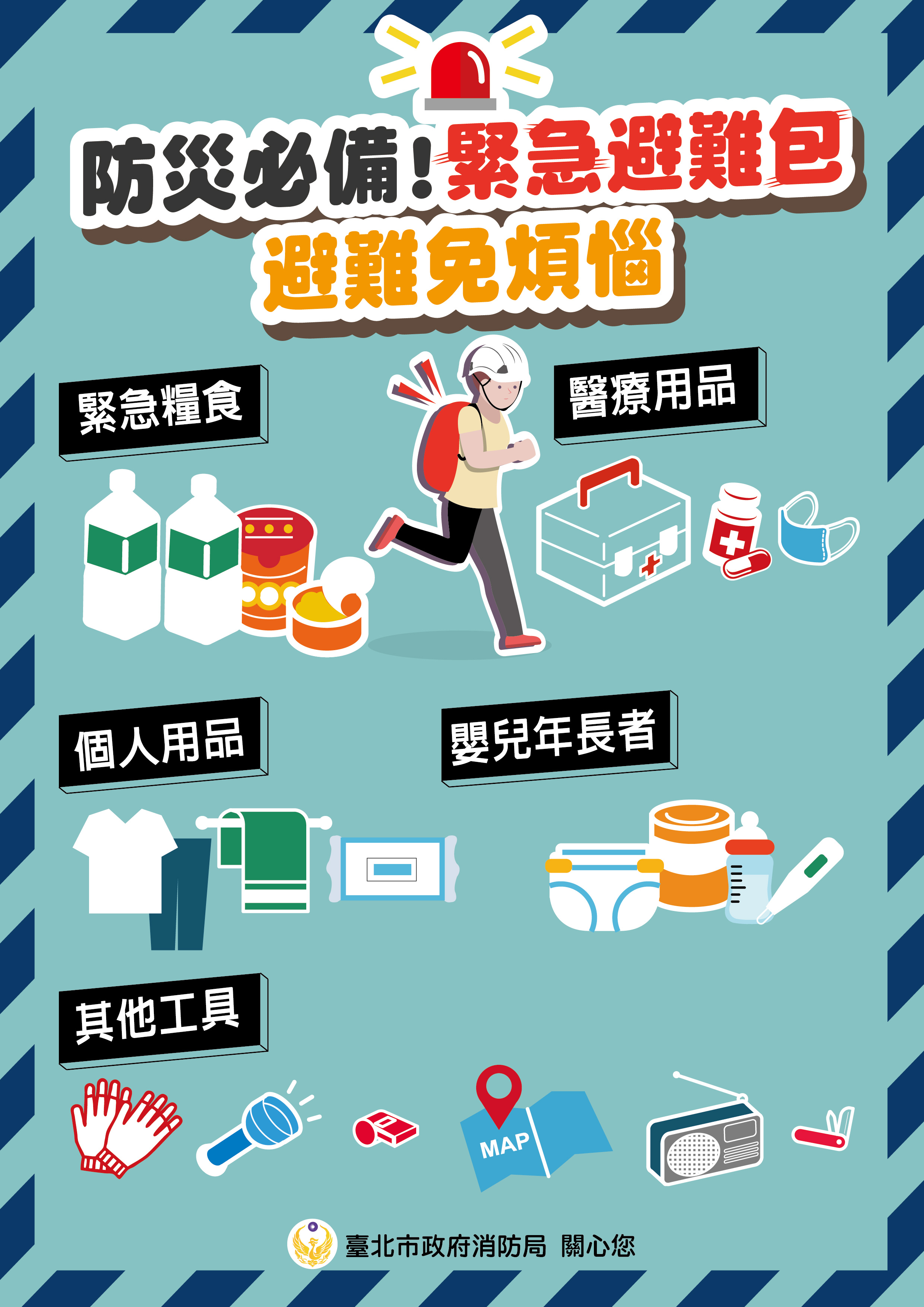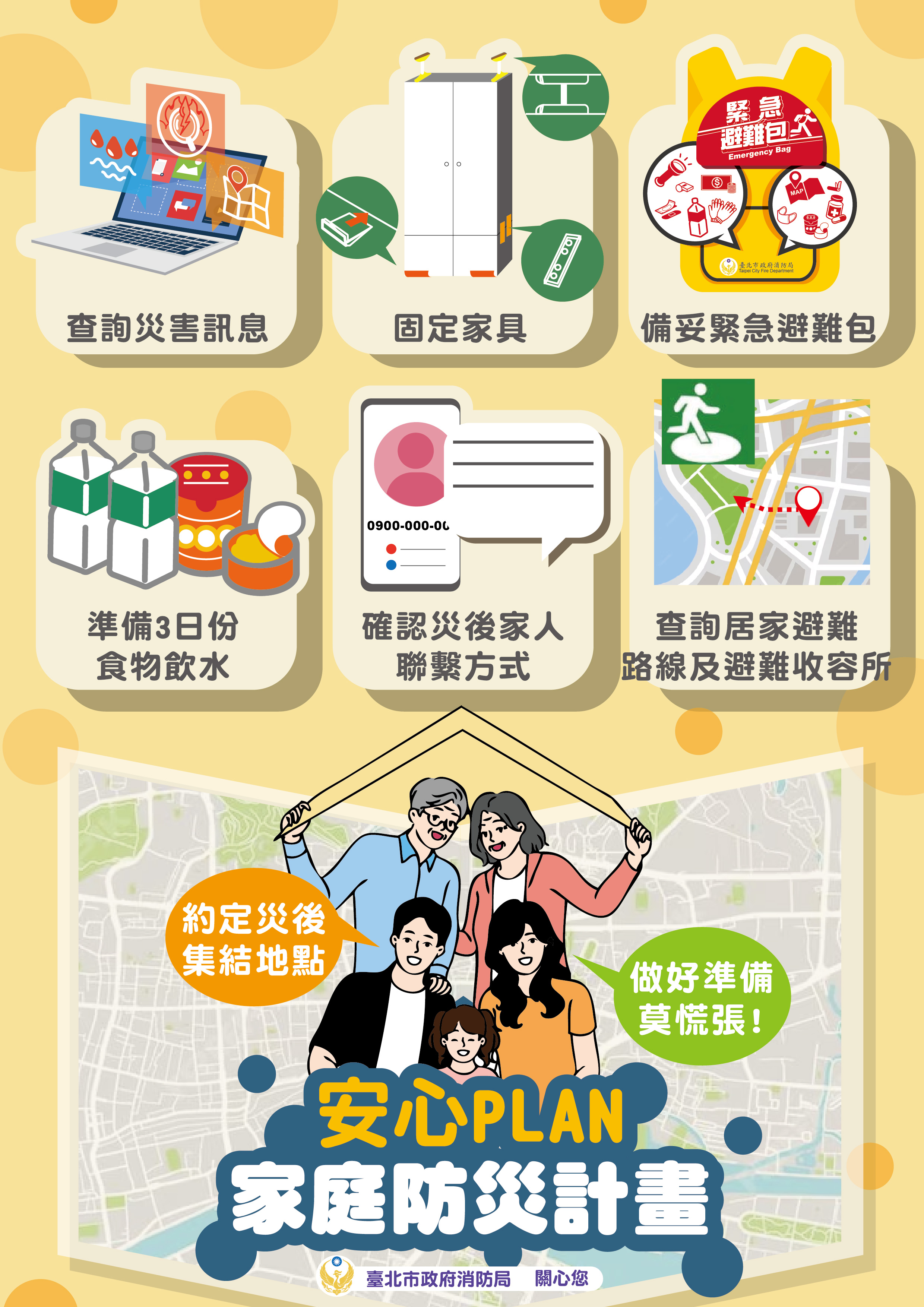 平時家具應固定,備妥日常儲備物資及緊急避難包。如遇地震,保持冷靜,立即採取「趴下、掩護、穩住」之動作,保護頭頸部,避免受傷。