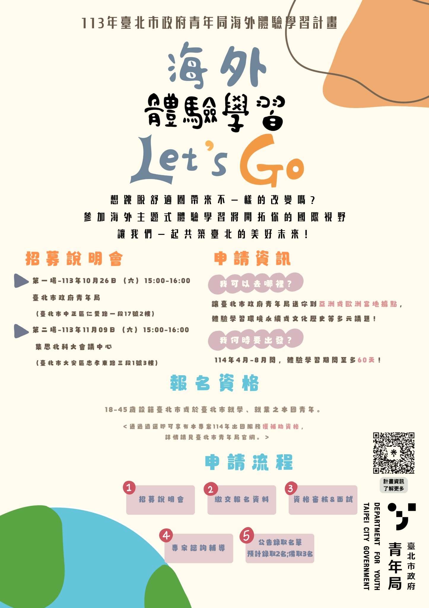 臺北市政府青年局為提升本市青年的國際視野與參與度,推出「113年臺北市海外體驗學習計畫」。本計畫旨在鼓勵青年挑戰自我,拓展跨文化溝通能力,並關注公共議題的發展,現正接受報名,歡迎符合資格的青年踴躍參加。