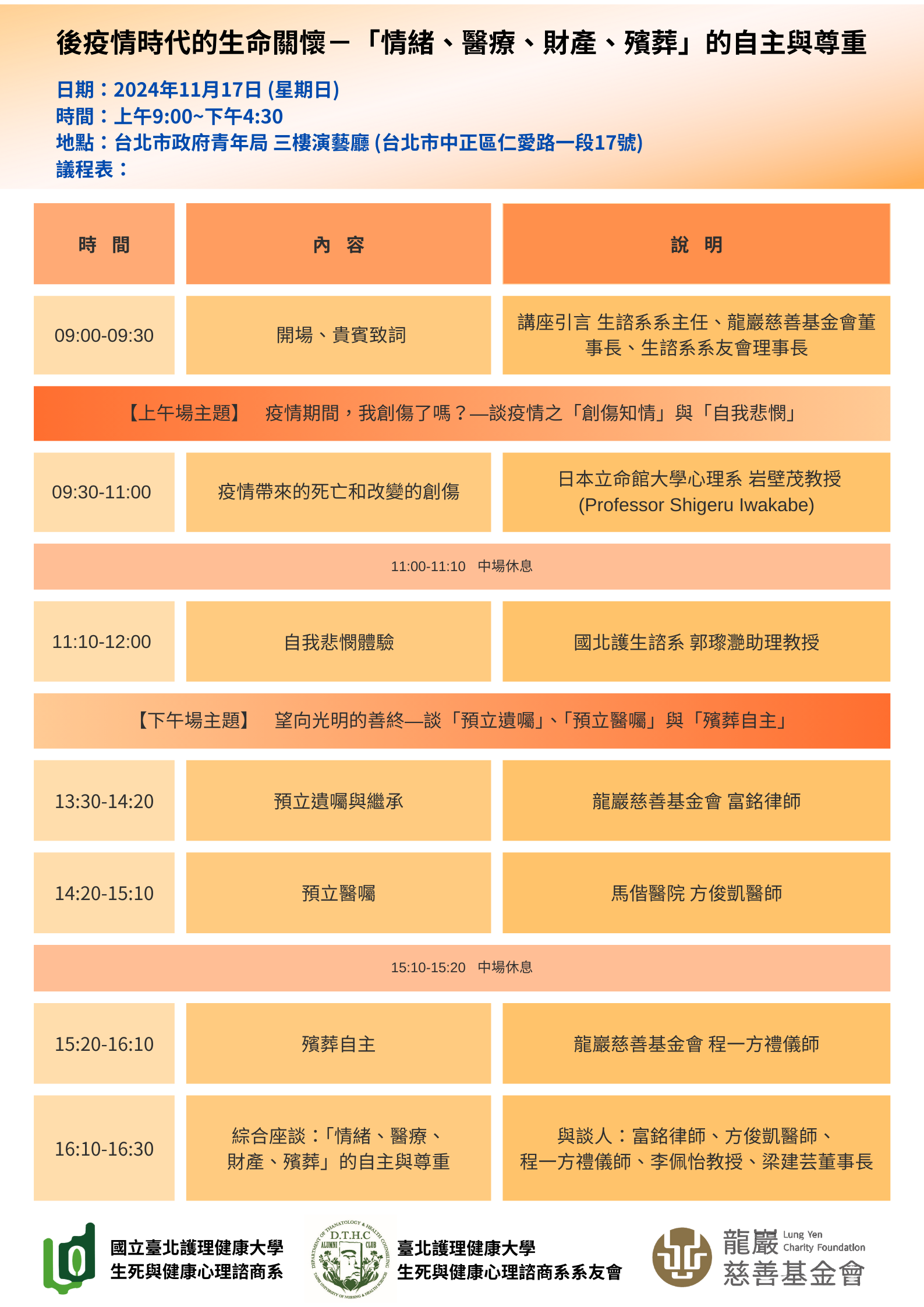 講座主題:「後疫情時代的生命關懷—『情緒、醫療、財產、殯葬』的自主與尊重」