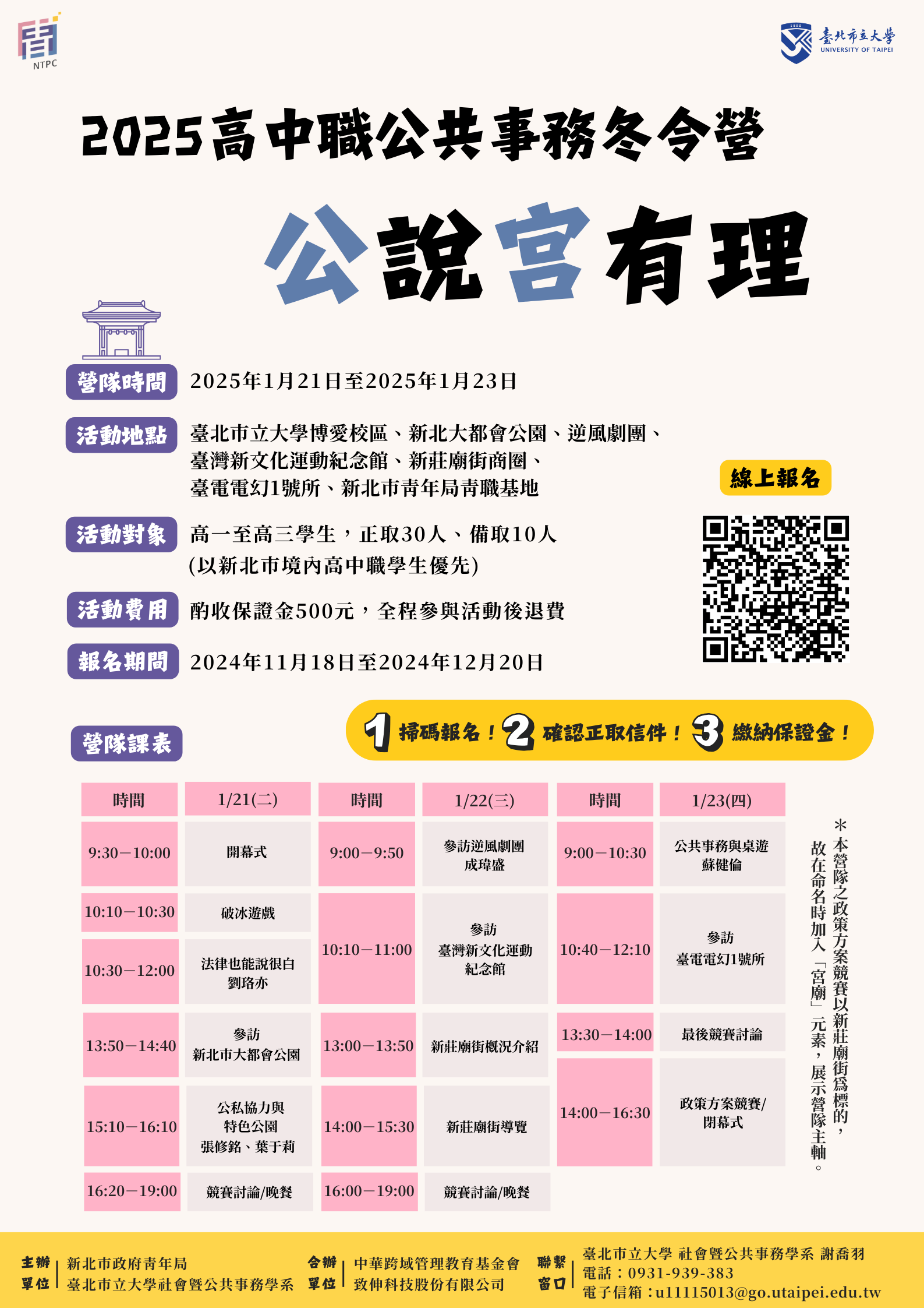 新北市青年局與臺北市立大學社會暨公共事務學系合作舉辦「2025高中職公共事務冬令營-公說宮有理」,旨在透過專家演講、政策競賽及移地教學等活動,激發學生對公共事務的創意與想法,並提供實踐平臺,展現改變社會的力量。