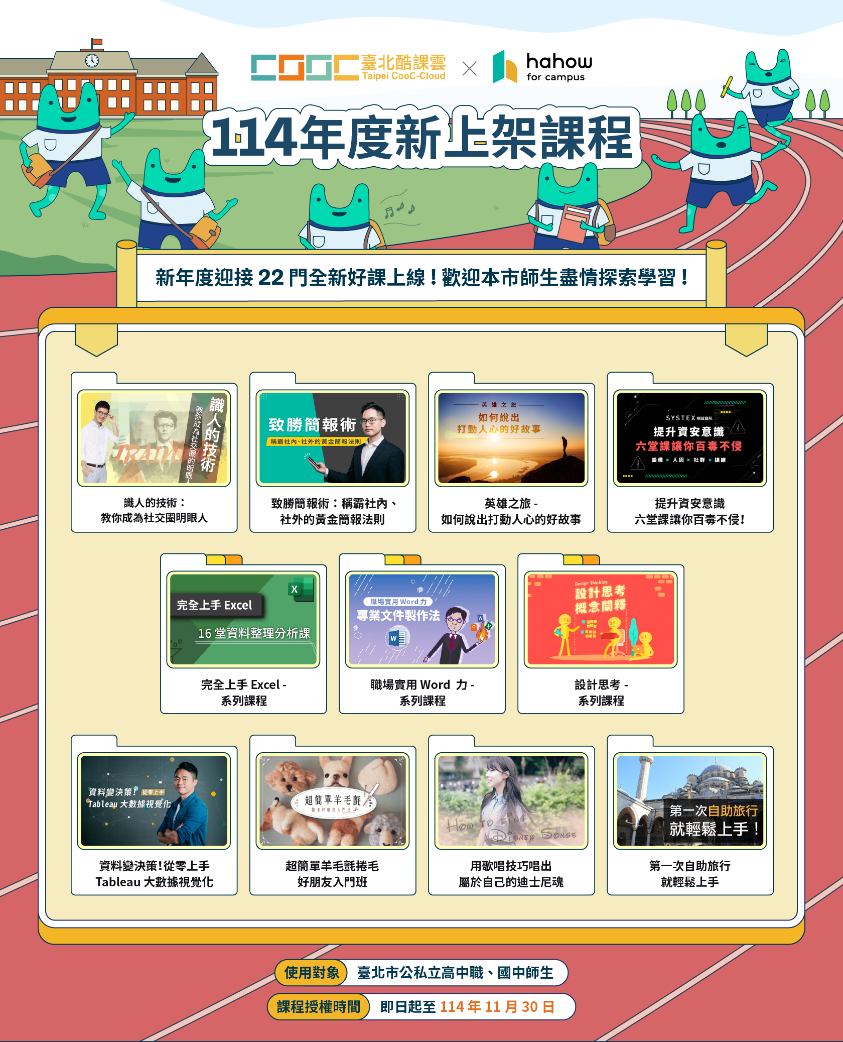 114年度更新臺北酷課雲多元跨域數位學習資源「Hahow for Campus」線上課程。