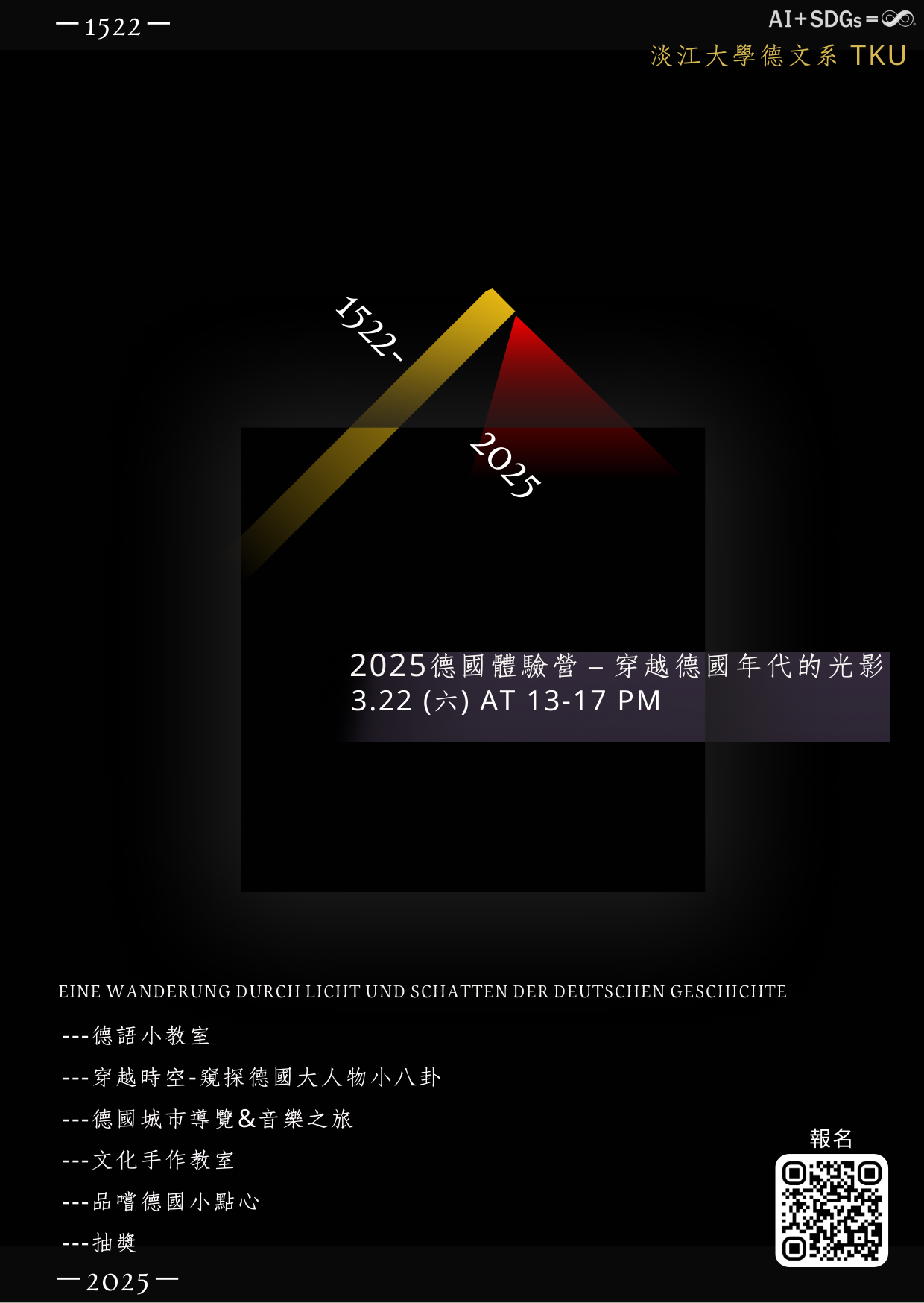為深化對德國文化與歷史的認識,本校德國語文學系特辦理「2025德國體驗營-穿越德國年代的光影」,透過多樣化的體驗活動,帶領參與者探索德國的歷史脈絡及文化風采。
