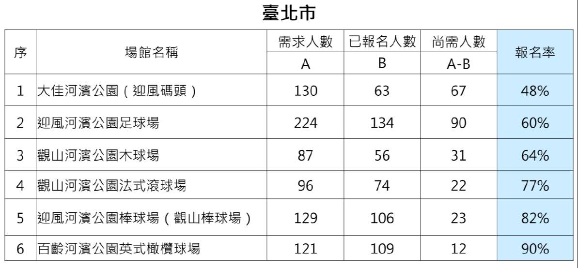 | 序號 | 場館名稱 | 需求人數 (A) | 已報名人數 (B) | 尚需人數 (A-B) | 報名率 |