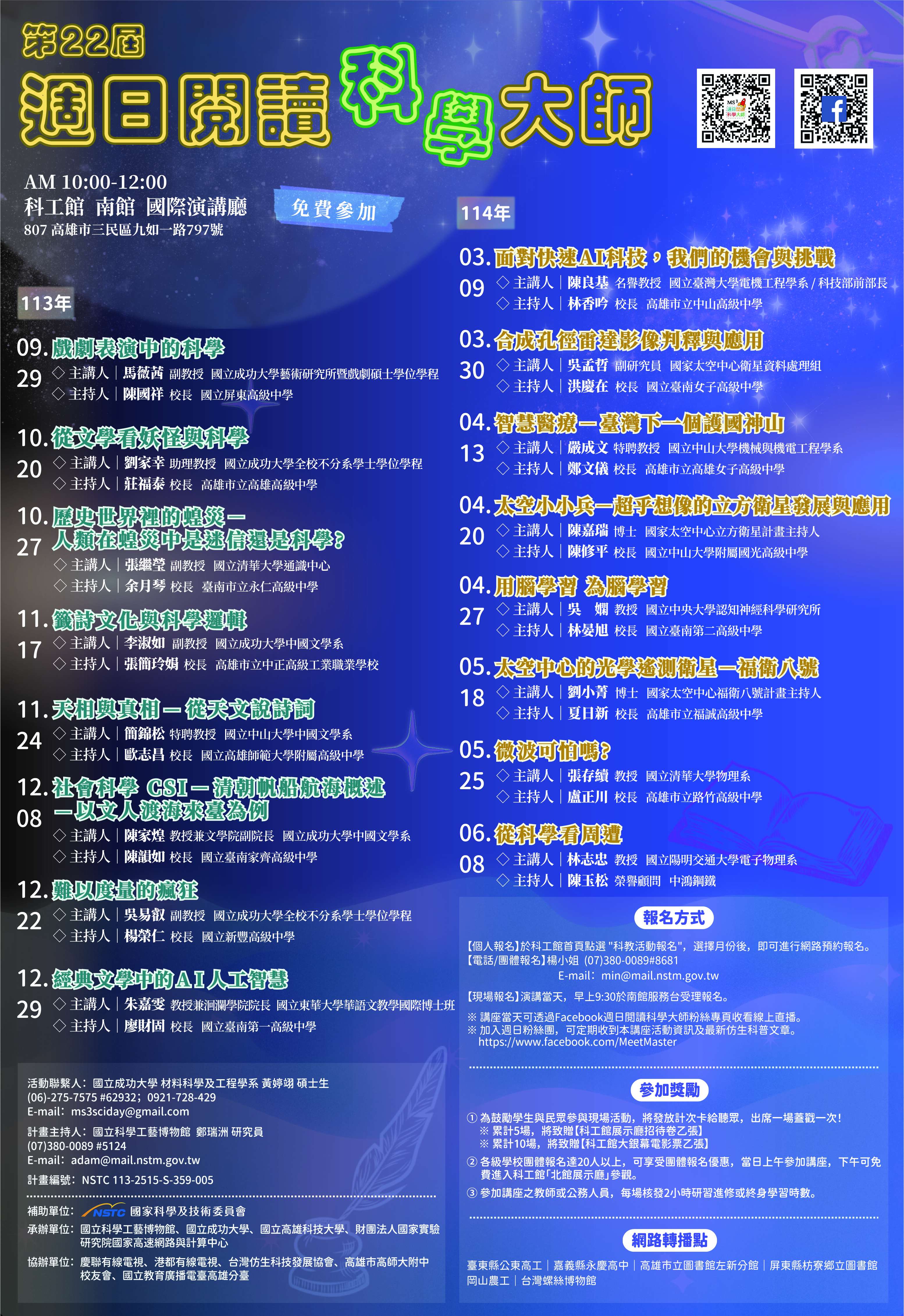 本活動由國立成功大學工學院主辦,邀請國內多位知名專家學者,透過多場次的科學講座,分享科學的知識與應用,增進參加者的科學素養與視野。活動全程免費,歡迎有興趣的師生參加。