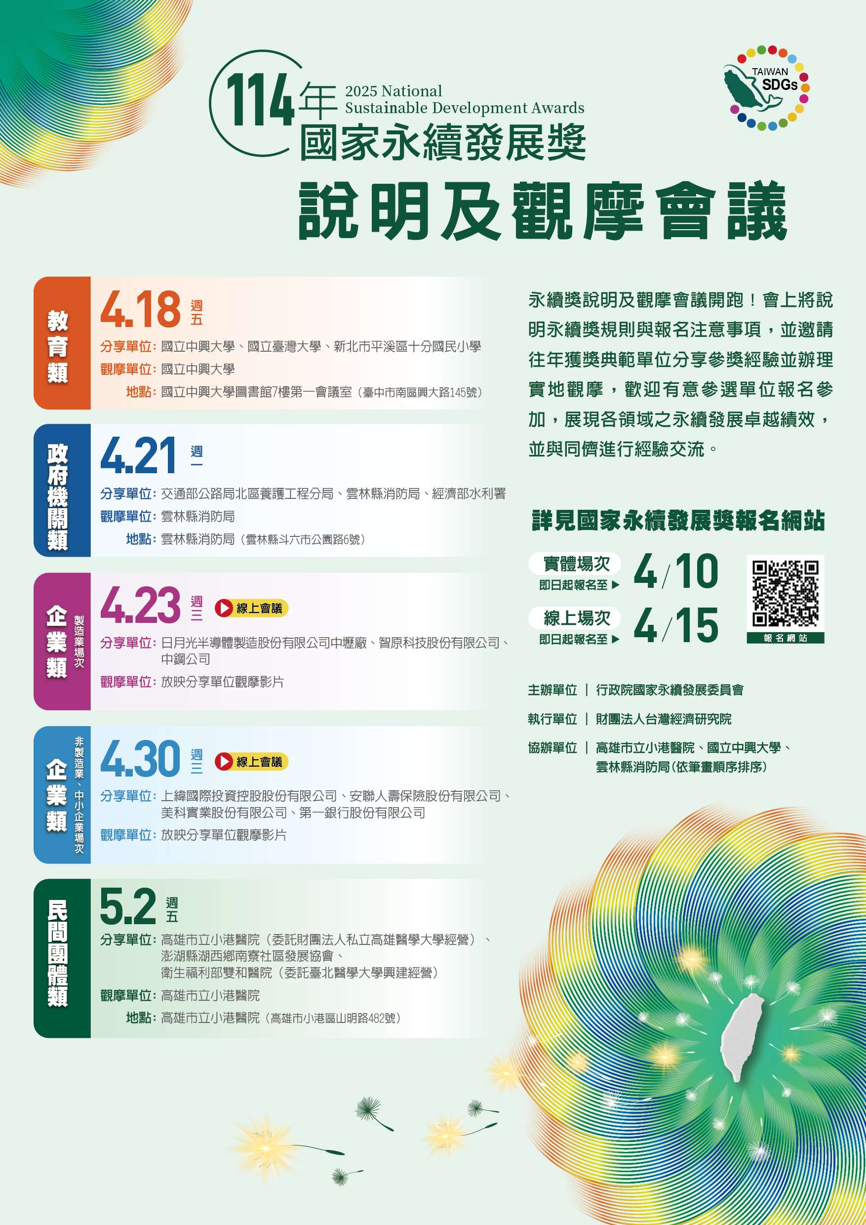 三、為促進對該獎項之了解與經驗交流,主辦單位將舉辦「114年國家永續發展獎說明及觀摩會議」,教育類場次資訊如下:
