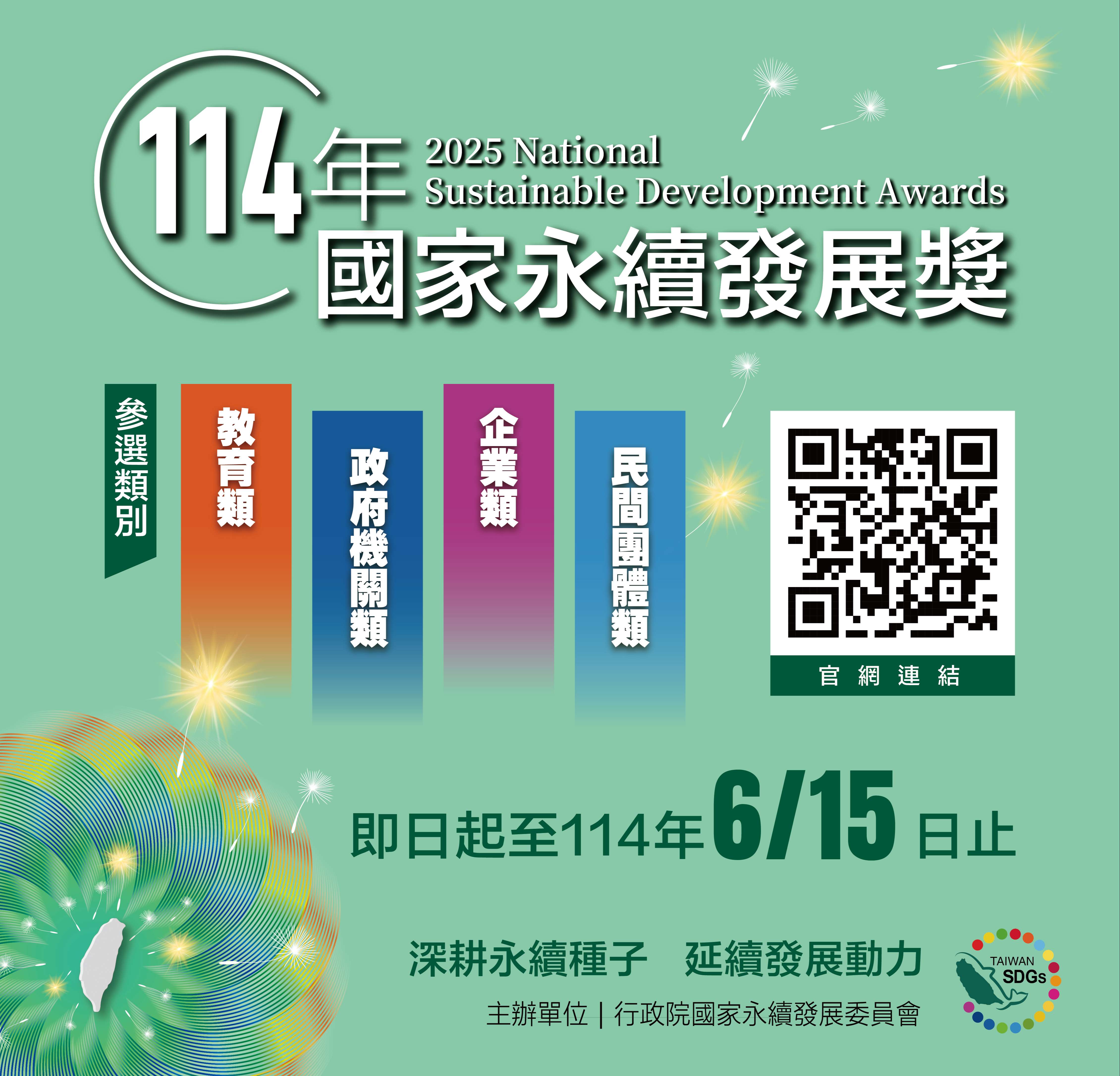 本校接獲臺北市政府教育局來文,轉知行政院國家永續發展委員會辦理「114年國家永續發展獎」相關資訊,鼓勵有意參與者踴躍報名,相關內容如下: