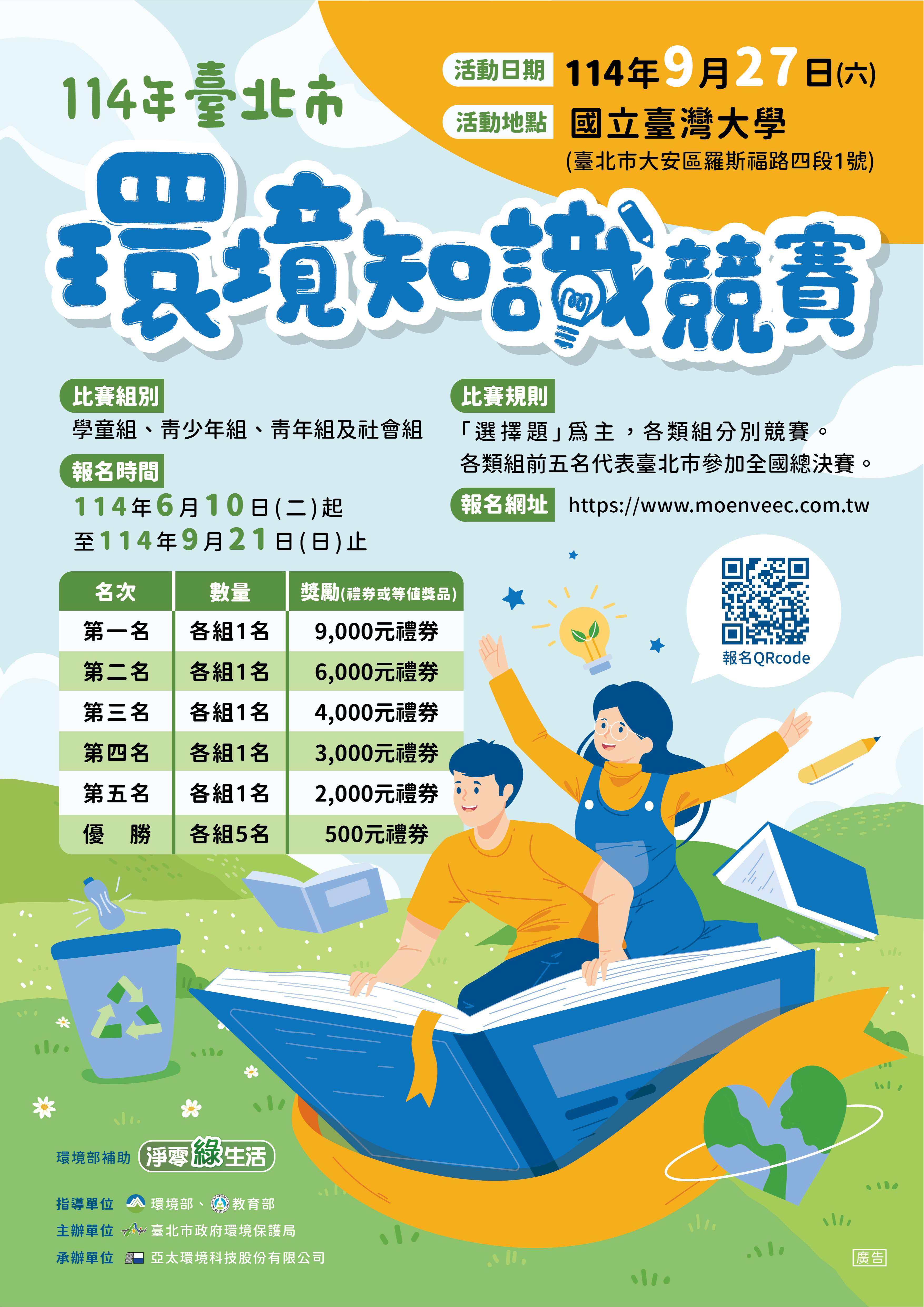 二、該局為推廣環境教育,辦理「114年環境知識競賽」,訂於114年9月27日(星期六)假國立臺灣大學舉行,惠請本校協助鼓勵師生踴躍報名參加。