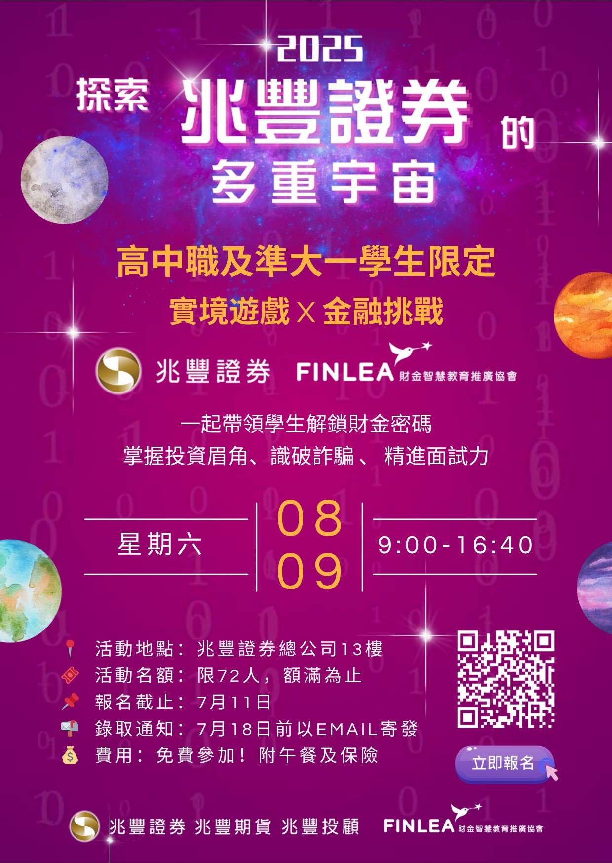 二、為協助青年學子提升財金素養與風險意識,兆豐證券股份有限公司與社團法人中華民國財金智慧教育推廣協會共同辦理「2025探索兆豐證券的多重宇宙」金融教育營隊,相關資訊如下: