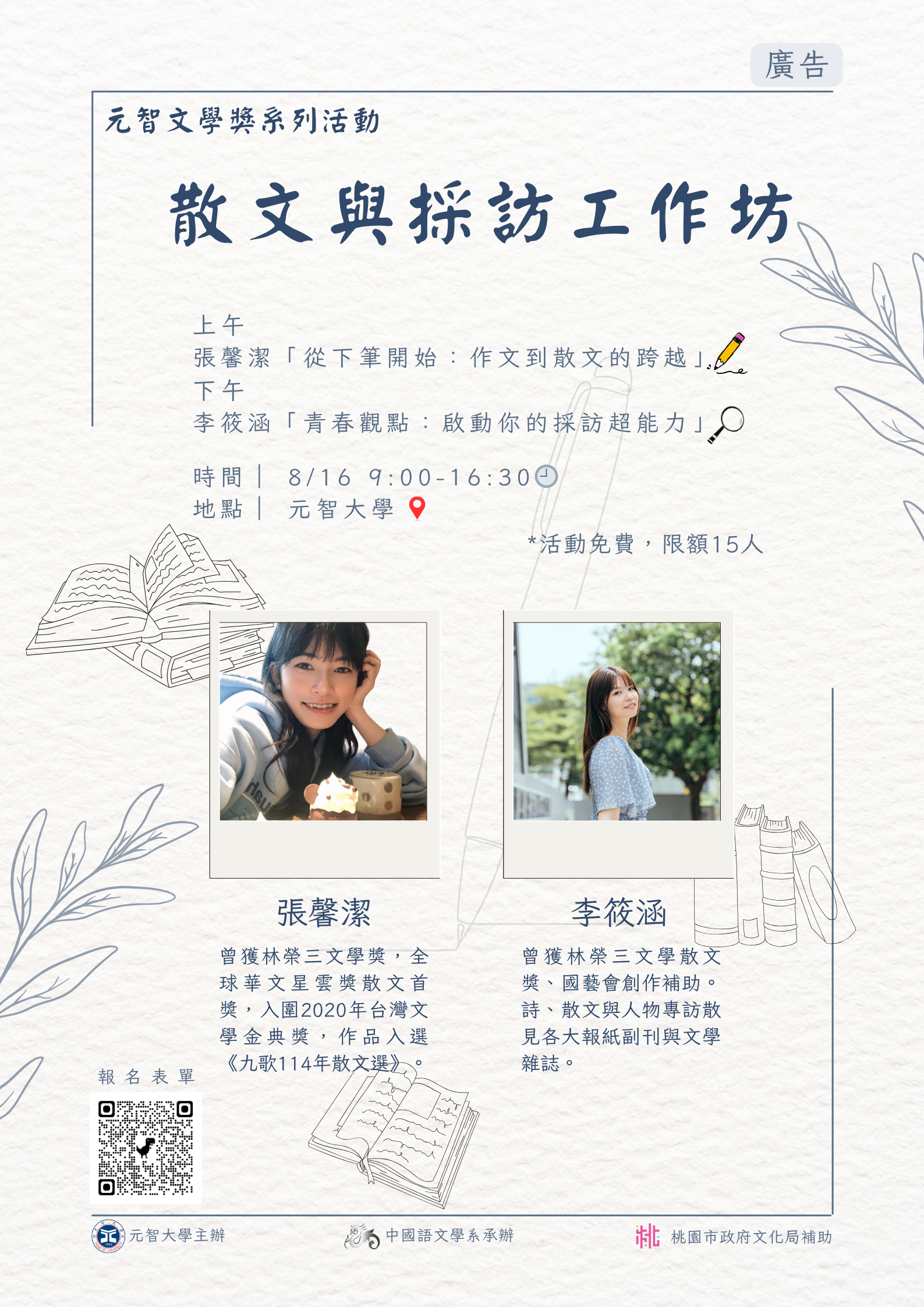 二、元智大學中國語文學系與桃園市文化局共同辦理「散文與採訪工作坊」,透過名師授課,鼓勵學生觀察、閱讀與表達,提升散文寫作與採訪技巧,歡迎有興趣之學生踴躍報名參加。