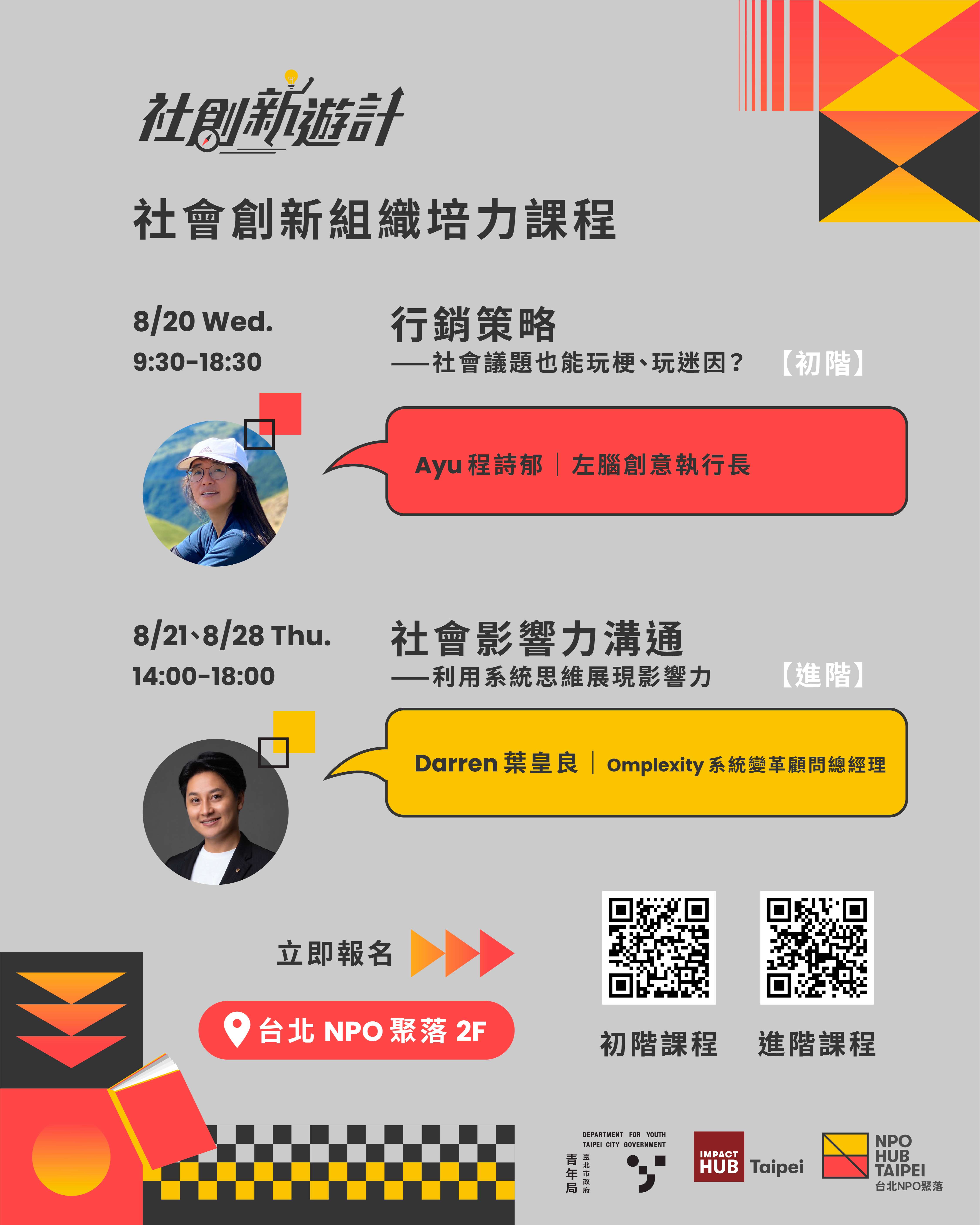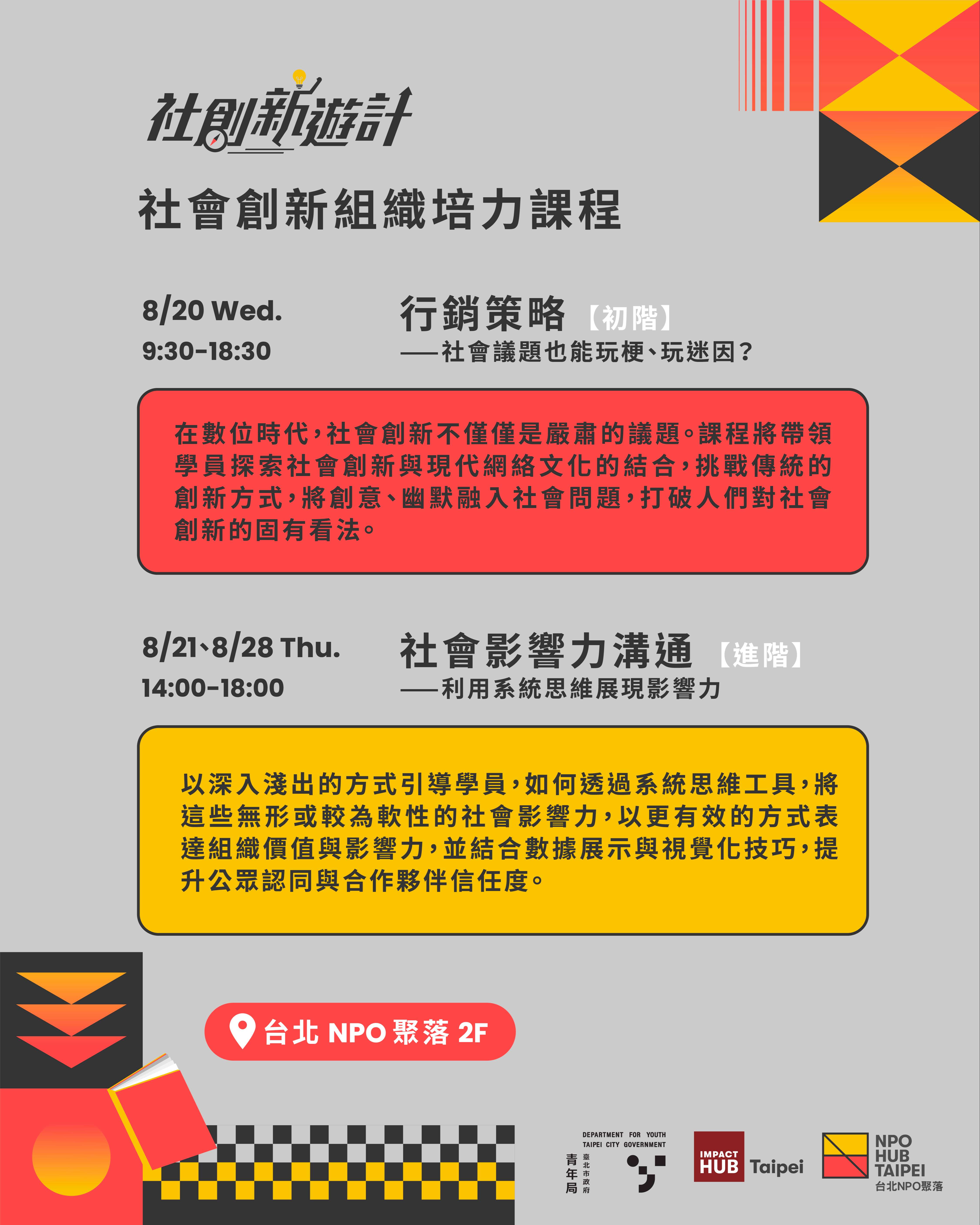 為支持青年投入社會創新並建立發展相關組織,臺北市政府青年局辦理「114年8月社會創新組織培力課程」,協助青年將創新想法轉化為可行方案,提升社會影響力。活動資訊如下: