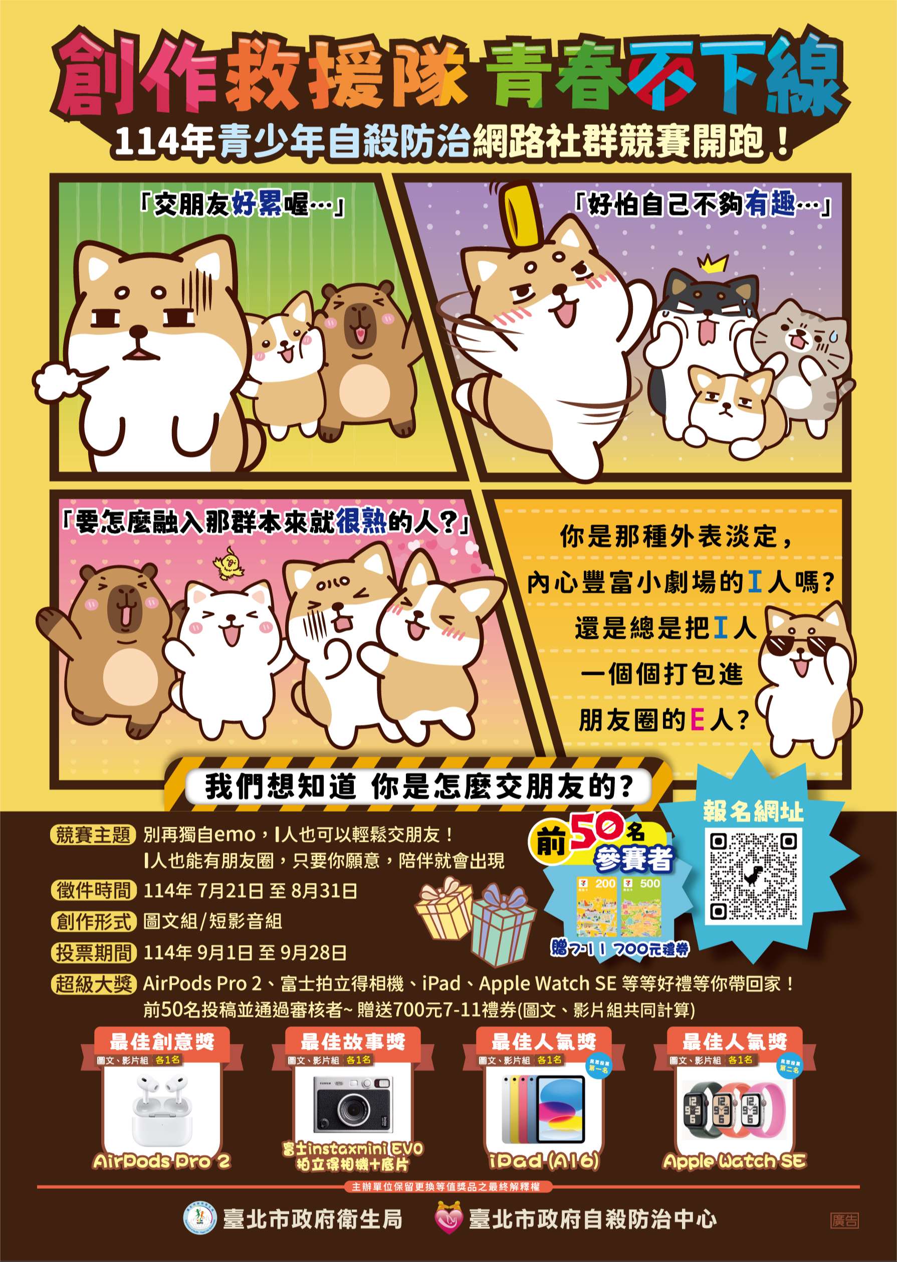 二、為強化15至24歲族群心理健康與自殺防治宣導,衛生局辦理「創作救援隊,青春不下線」自殺防治網路社群競賽,以「別再獨自emo,I人也可以輕鬆交朋友」為主題,邀請本國青少年透過短影片、圖文創作,分享情緒與交友歷程,藉以偵測自殺警訊、伸出援手,並覺察自身情緒低潮,學習適當求助方式。