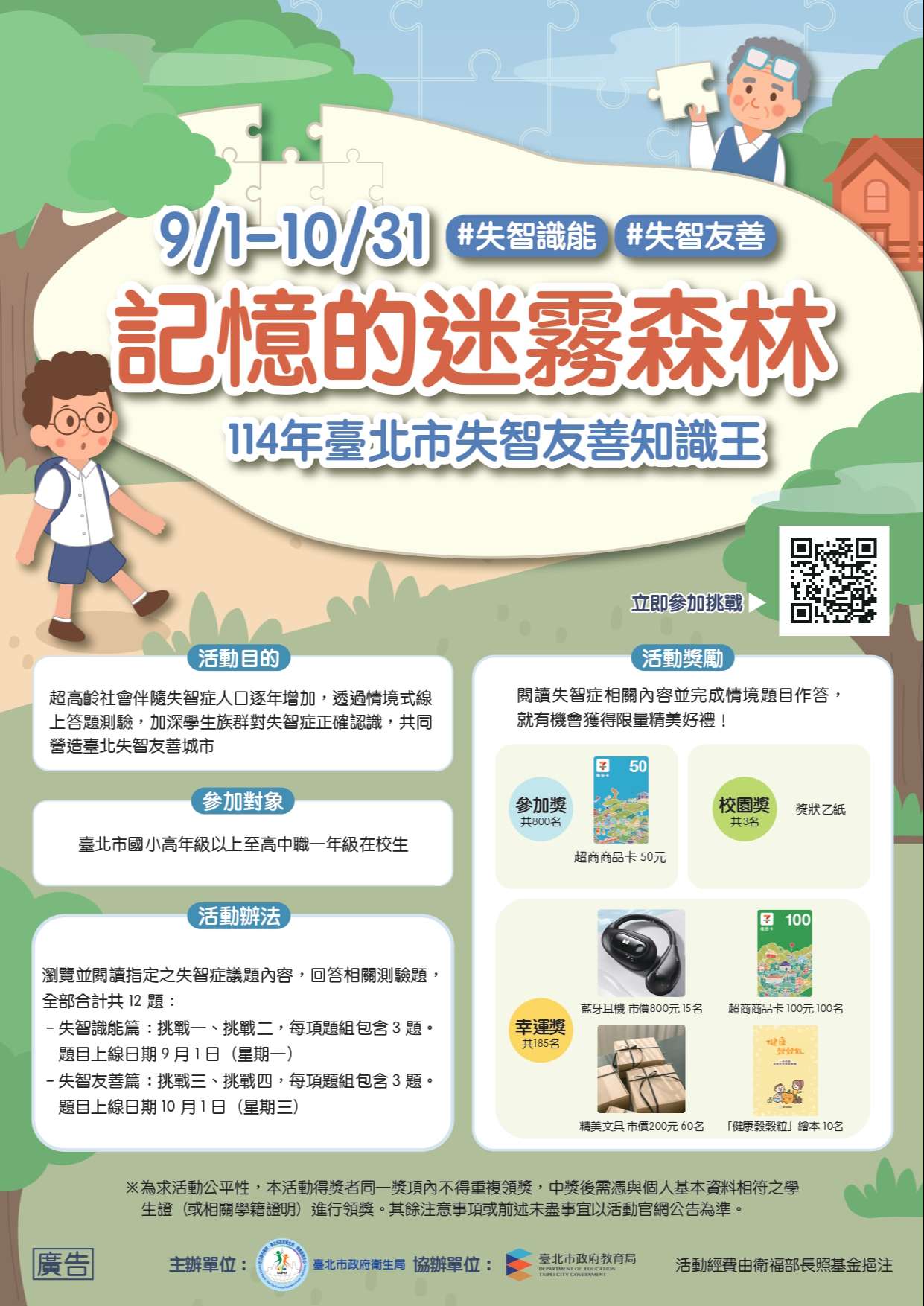 隨著失智症人口逐年增加,本活動透過情境式線上答題體驗,期望提升全民對失智症的正確認識,共同營造臺北市失智友善城市。