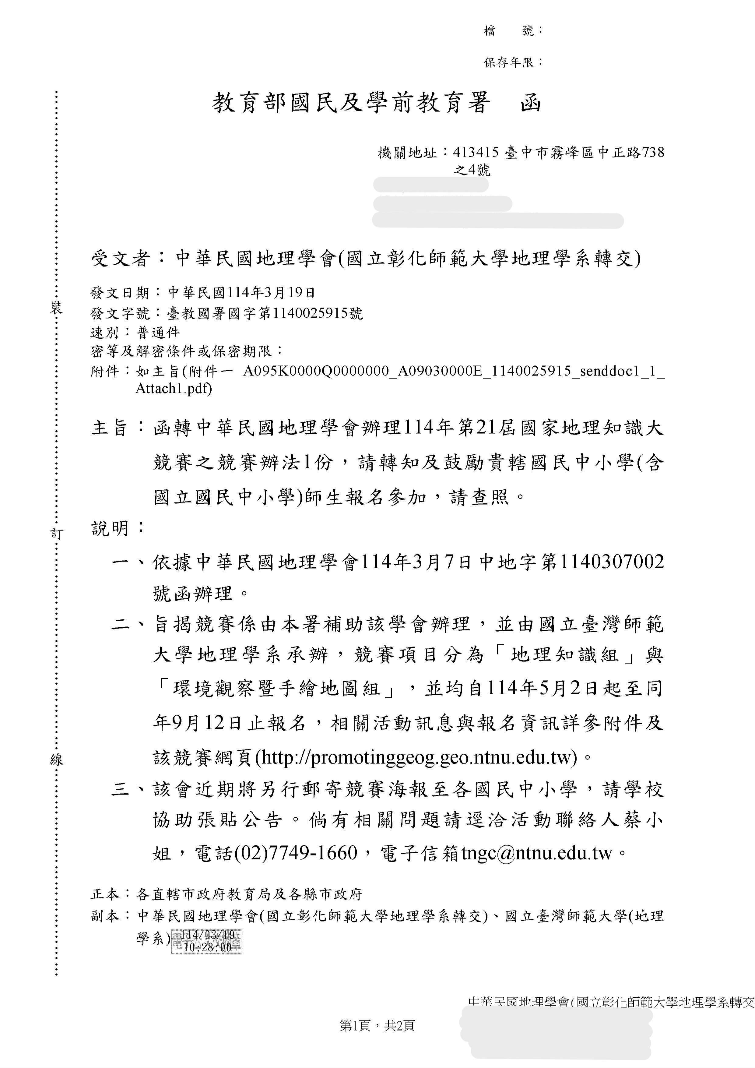 教育部國民及學前教育署函轉中華民國地理學會辦理「第21屆國家地理知識大競賽」,相關訊息如下: