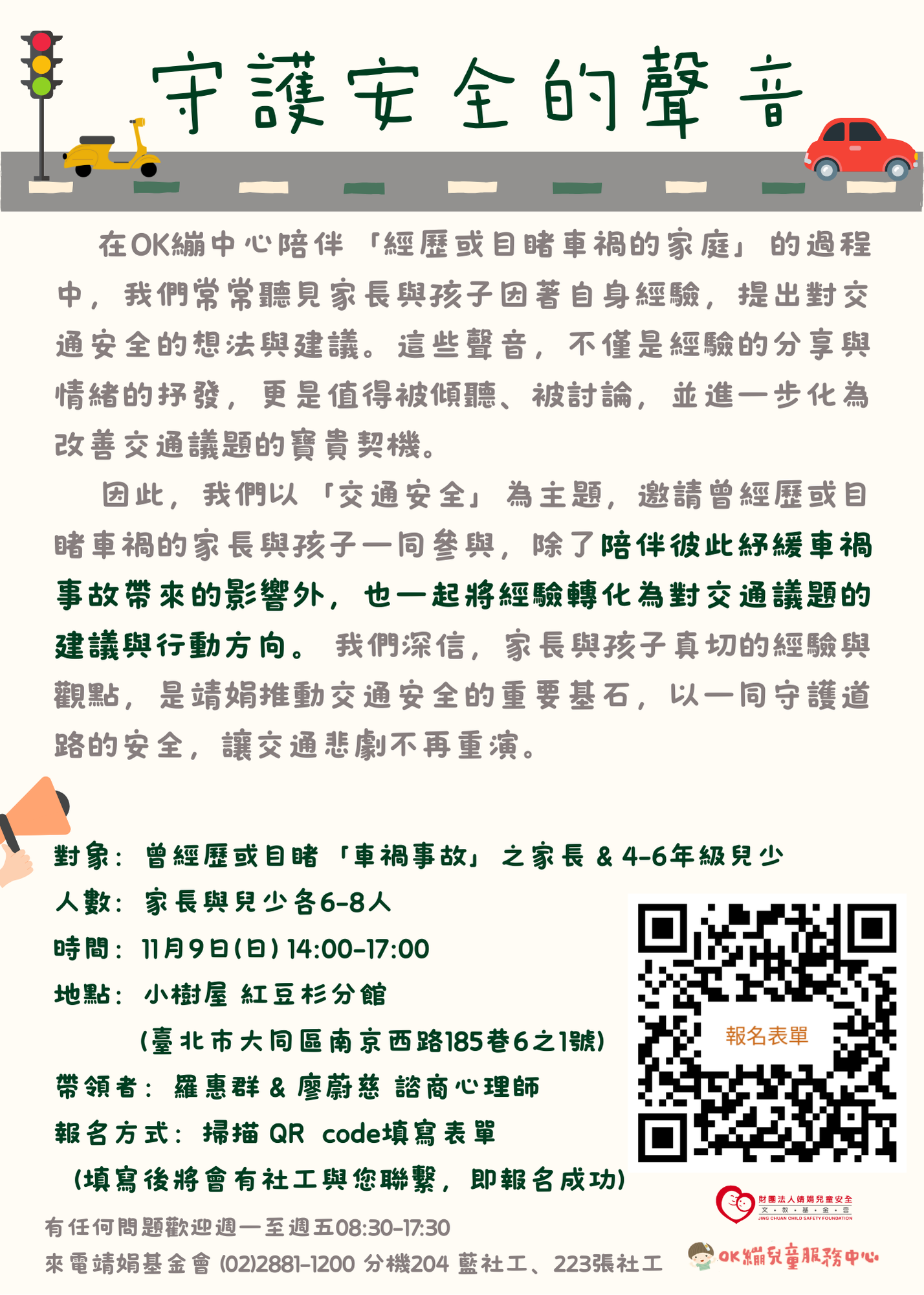 二、活動邀請曾經歷或目睹車禍之家長及4至6年級兒少共同參與,除協助家長及兒少紓緩事故影響外,亦希望透過經驗分享與意見凝聚,討論交通環境之改善方向。