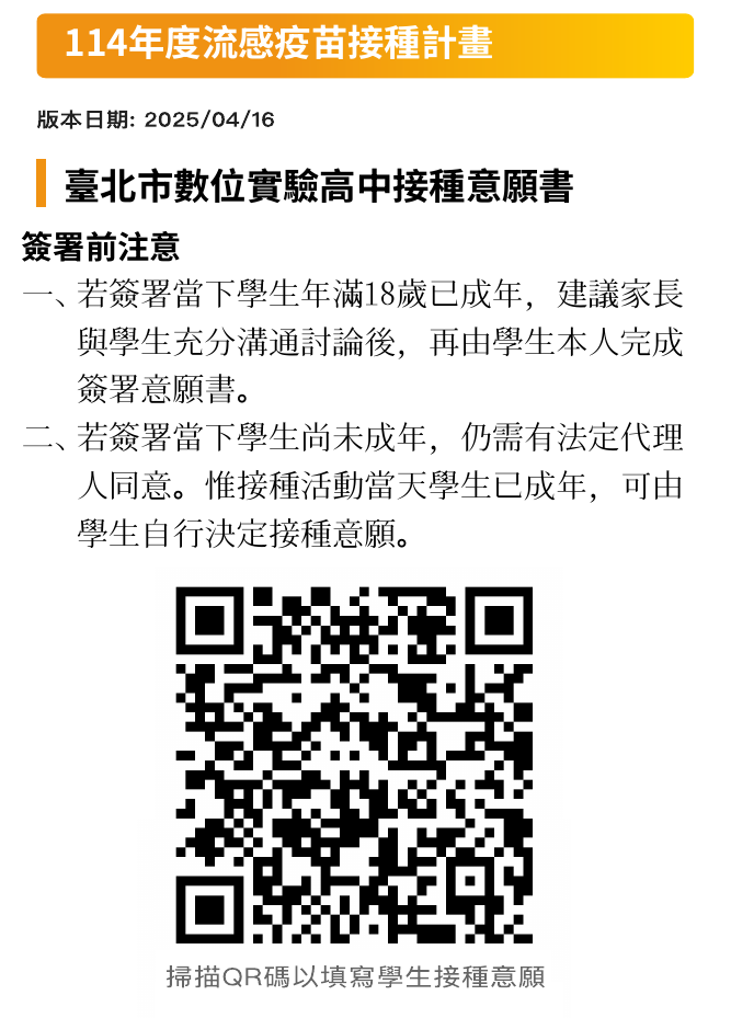 ▲若要變更接種意願,截止日前可以重複掃描本校專屬QR code或點選專屬網址連結更改意願(資料將會覆蓋前一筆,以最後一筆為主)。
