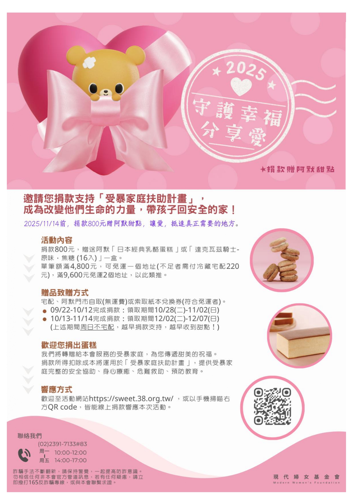 歡迎透過本會「2025守護幸福分享愛」活動網頁線上捐款 https://sweet.38.org.tw,或傳真回覆紙本捐款單捐款 (詳見附件1)。