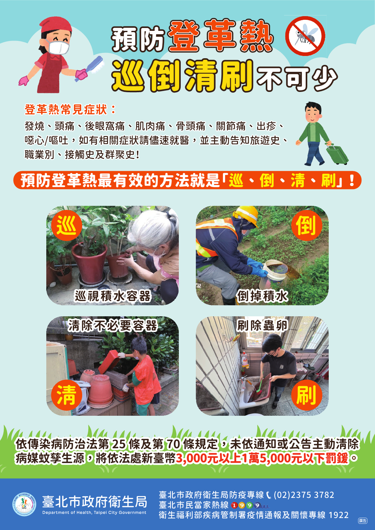 感染源多來自東南亞國家,以印尼為多,顯示登革熱流行疫情風險增加。目前正值登革熱流行期,且近期天氣型態適合病媒蚊生長與活動,為防範登革熱疫情擴散,請加強以下防治工作: