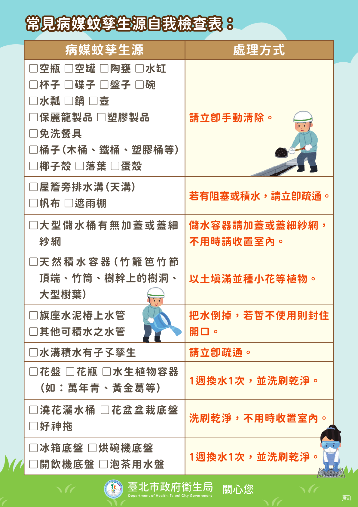 (一)落實校園環境管理,加強雨後戶內外環境巡查、清除積水容器,以降低病媒蚊密度;如出現登革熱疑似症狀應儘速就醫,主動告知醫師旅遊史及活動史。